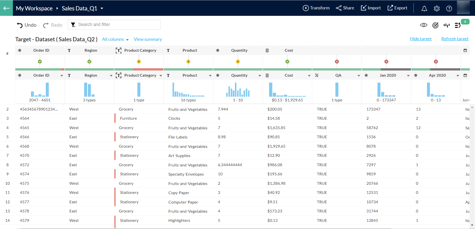 5. ターゲット照合エラーパネルでのフィルター選択は、DataPrep Studioページのグリッドにも適用されます。