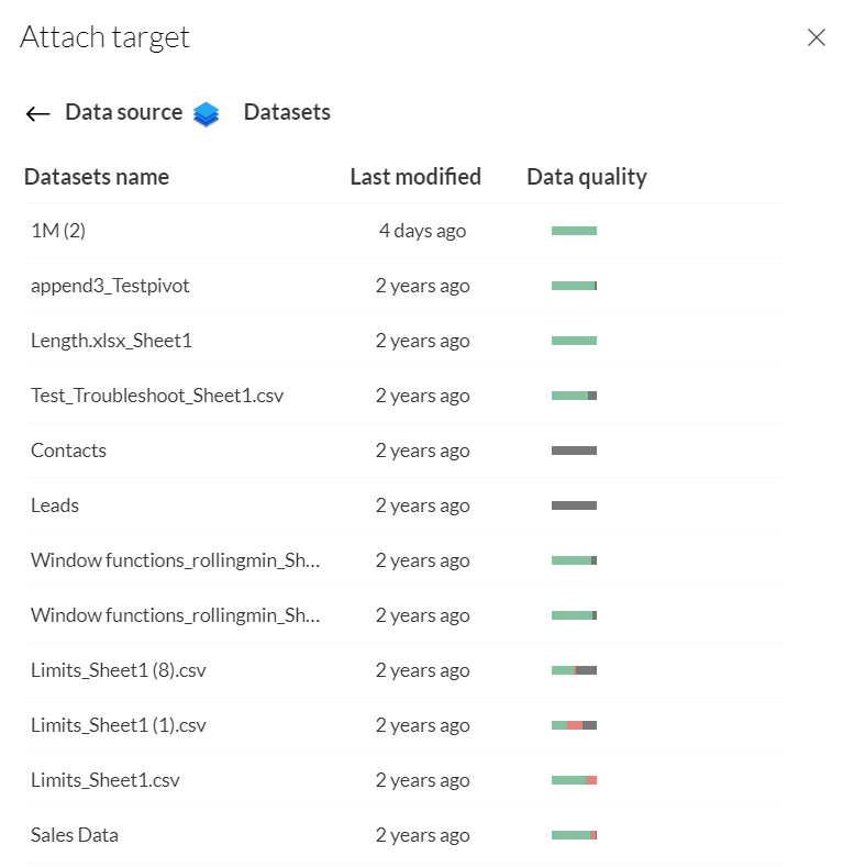 2. データセットオプションをクリックし、現在のワークスペース内から既存のデータセットのいずれかを選択します。