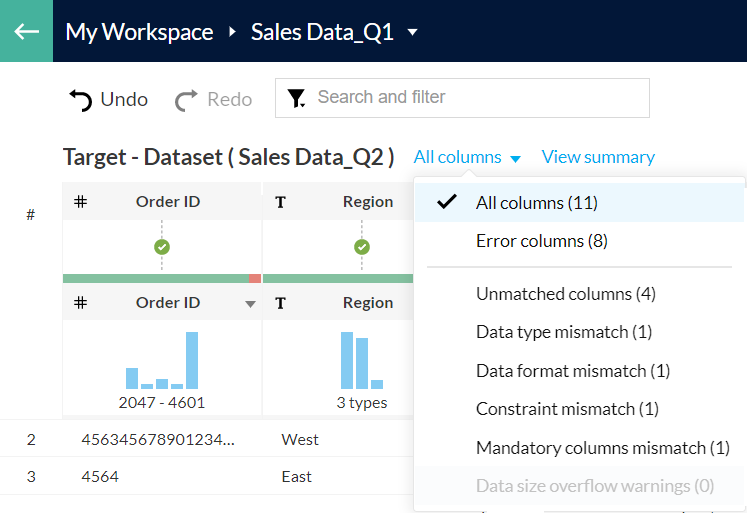 5. データ元と target のすべての列は初期設定でグリッドに表示されます。ただし、すべての列ドロップダウンをクリックし、設定を選択することで、エラー列や未照合列など、特定の列だけを表示できます。