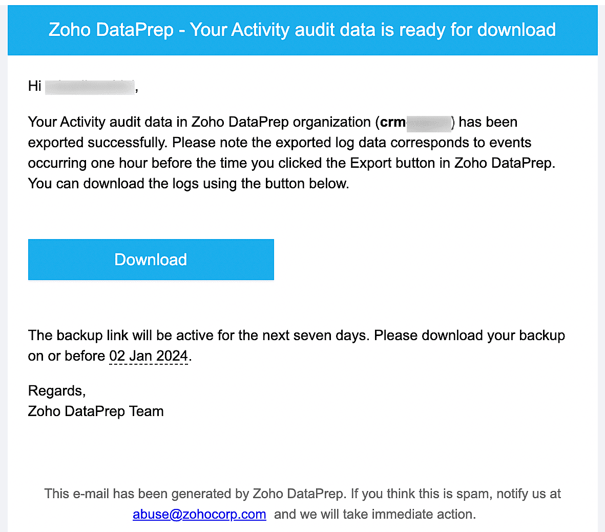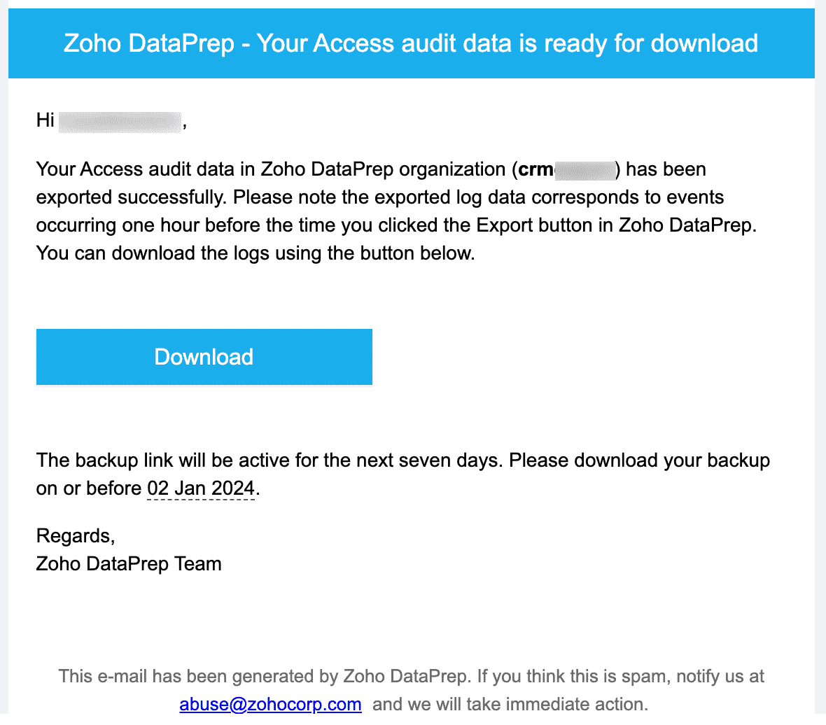 エクスポートするアクセスログデータには、処理や差出人が含まれます。直近2年間から1時間前までのデータが対象です。次回クリック前までエクスポートするボタン(Zoho DataPrep内)をクリックしてください。この期間は、管理者が監査を有効化した時点から計算されます。