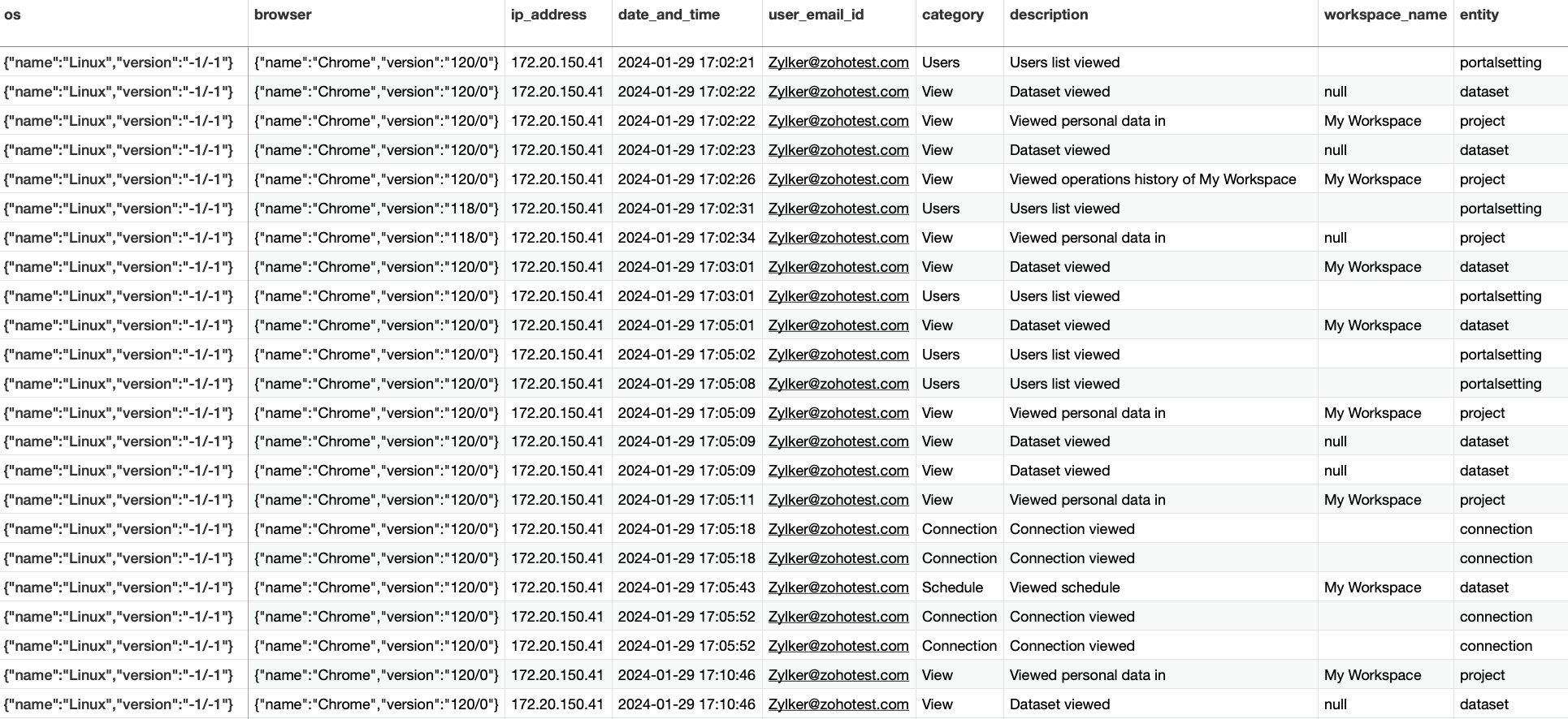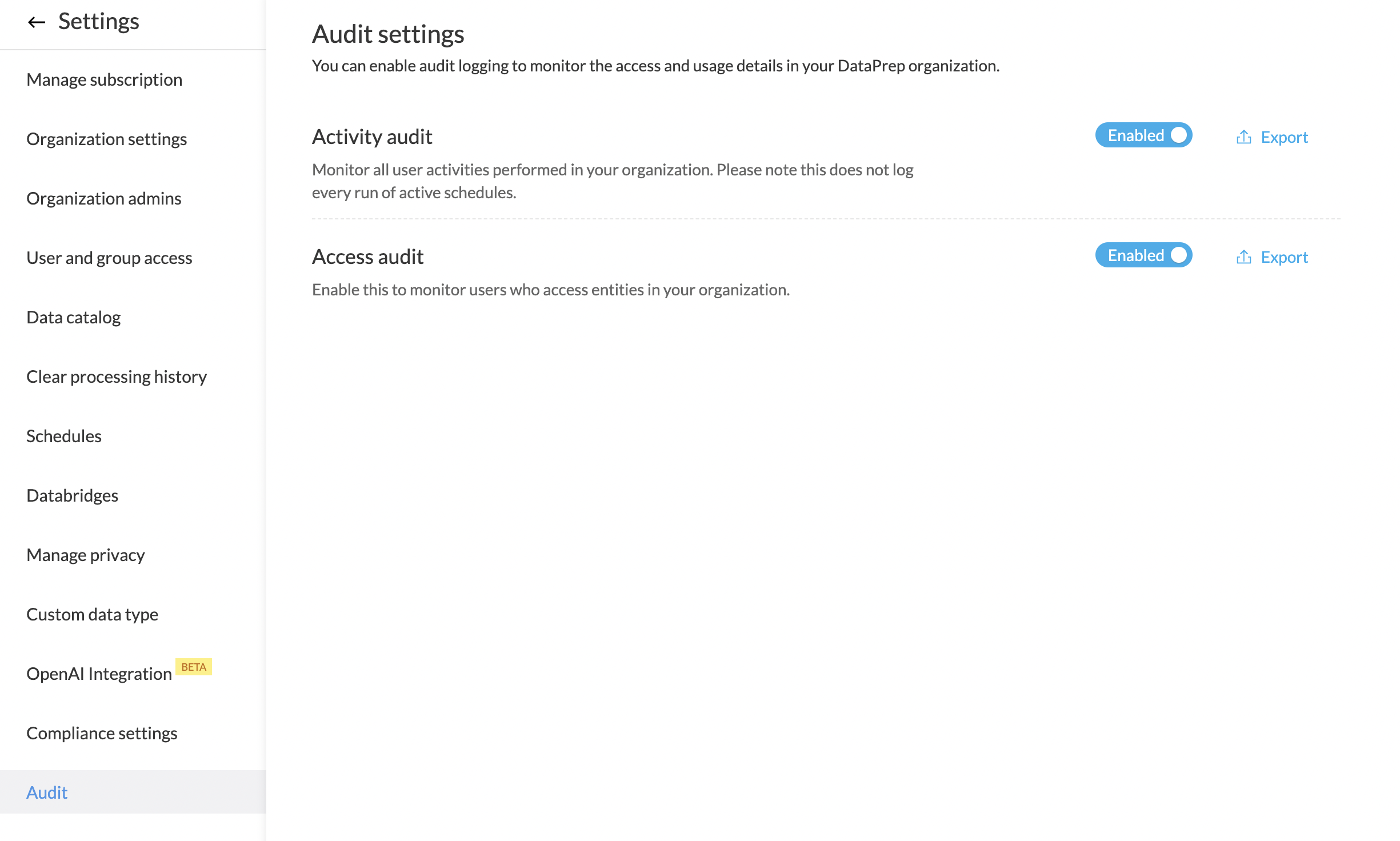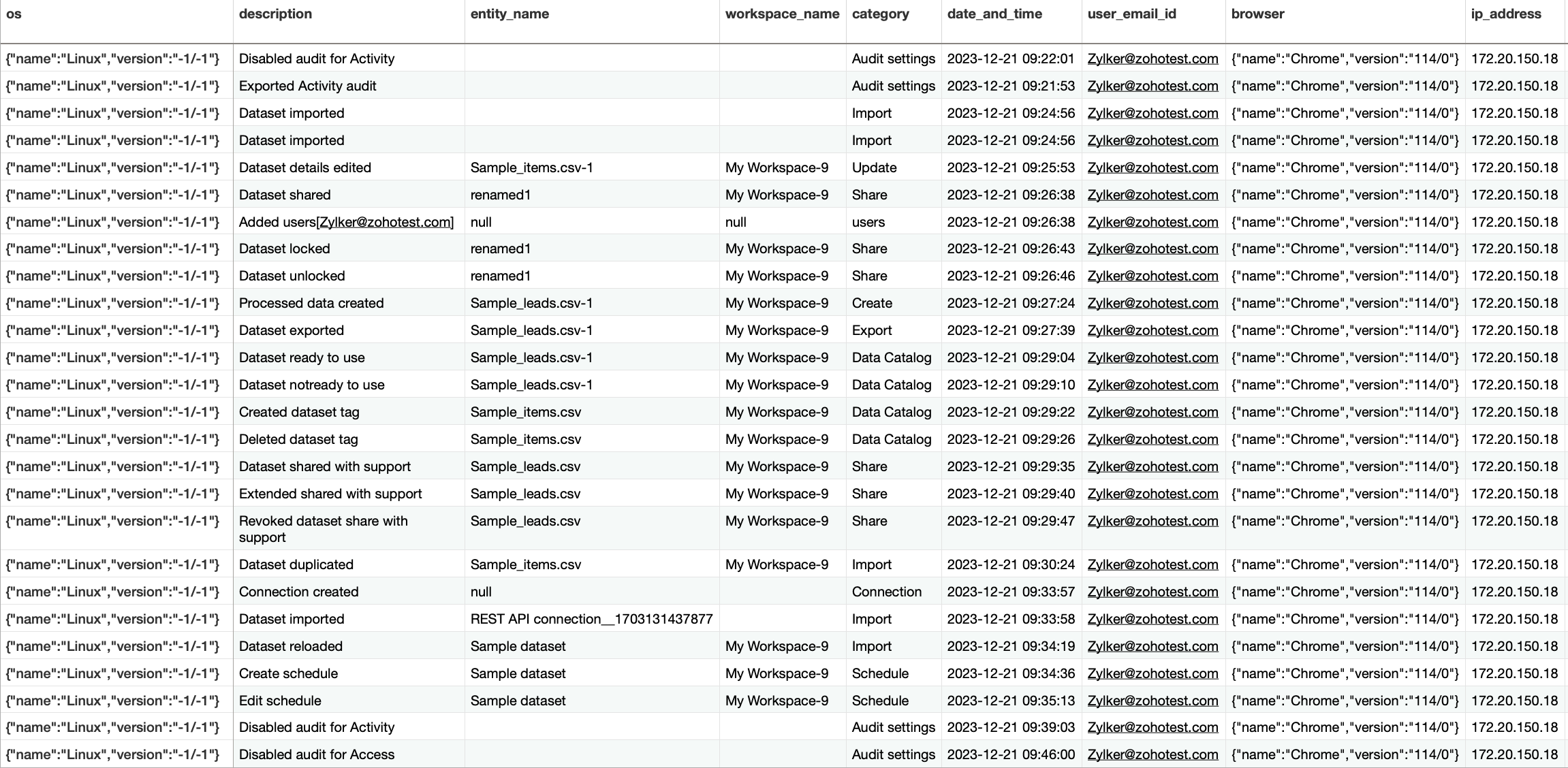Zoho DataPrep では、管理すべて ユーザーアクティビティやユーザーアクセス権をyour 組織で、Auditタブ(設定内)を使用して管理できます。また、監査ログのエクスポートやダウンロードも可能です。