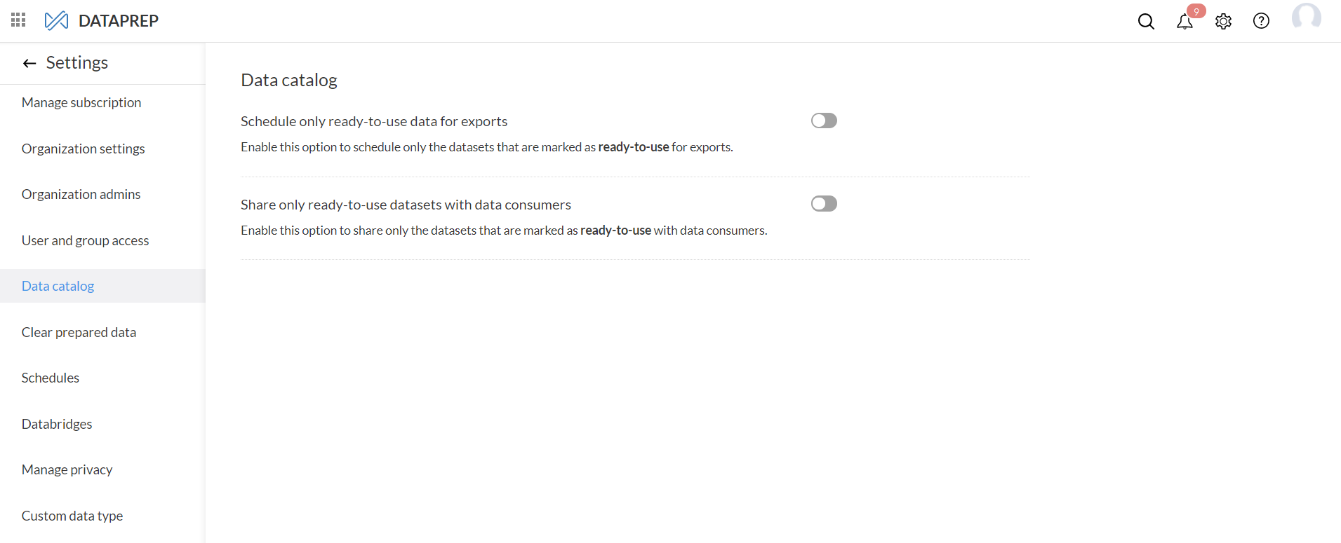 - 「使用する準備ができている」データセットのみデータ利用者と共有する: このオプションを有効にすると、ユーザーは組織内のデータ利用者と「使用する準備ができている」とマークされたデータセットのみ共有できます。