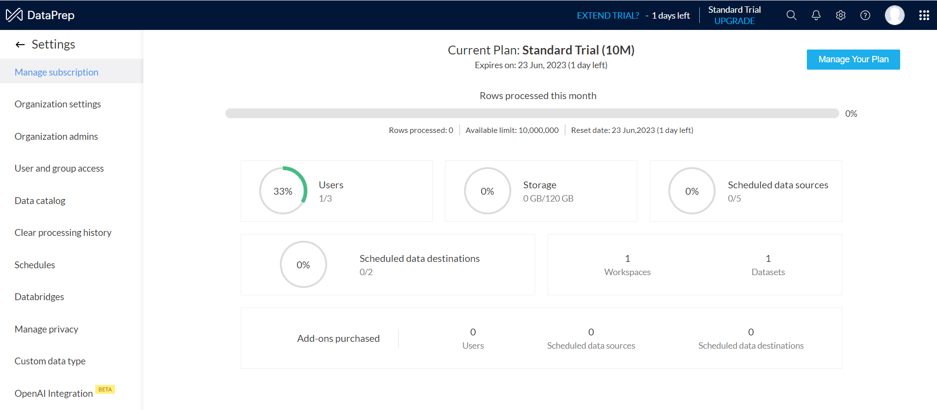 e. 続行するにはクリックしてください。プランをダウングレードすると、DataPrepのサブスクリプション管理ページに戻り、最新のサブスクリプション詳細を確認できます。