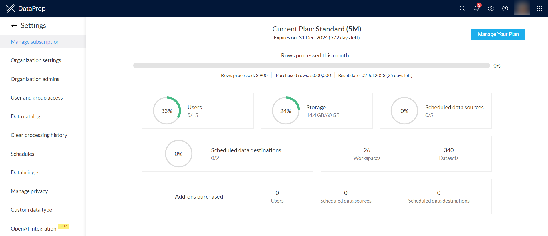 Zoho DataPrepでは、インポートしたデータセットの合計行数や、準備プロセス中に作成される中間データセットも「rows 処理済み」としてプランにカウントされます。サブスクリプション管理ページで、処理済み行数を確認できます。「rows 処理済み」の件数は、毎月の請求間隔の開始時にリセットされます。