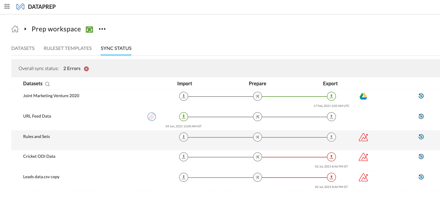 4. 引き継ぎたいスケジュールが設定されているデータセット名をクリックします。この例では、Prepワークスペース一覧の同期ステータス表示画面にRules and Setsデータセットのスケジュールが設定されています。データセット名をクリックします。