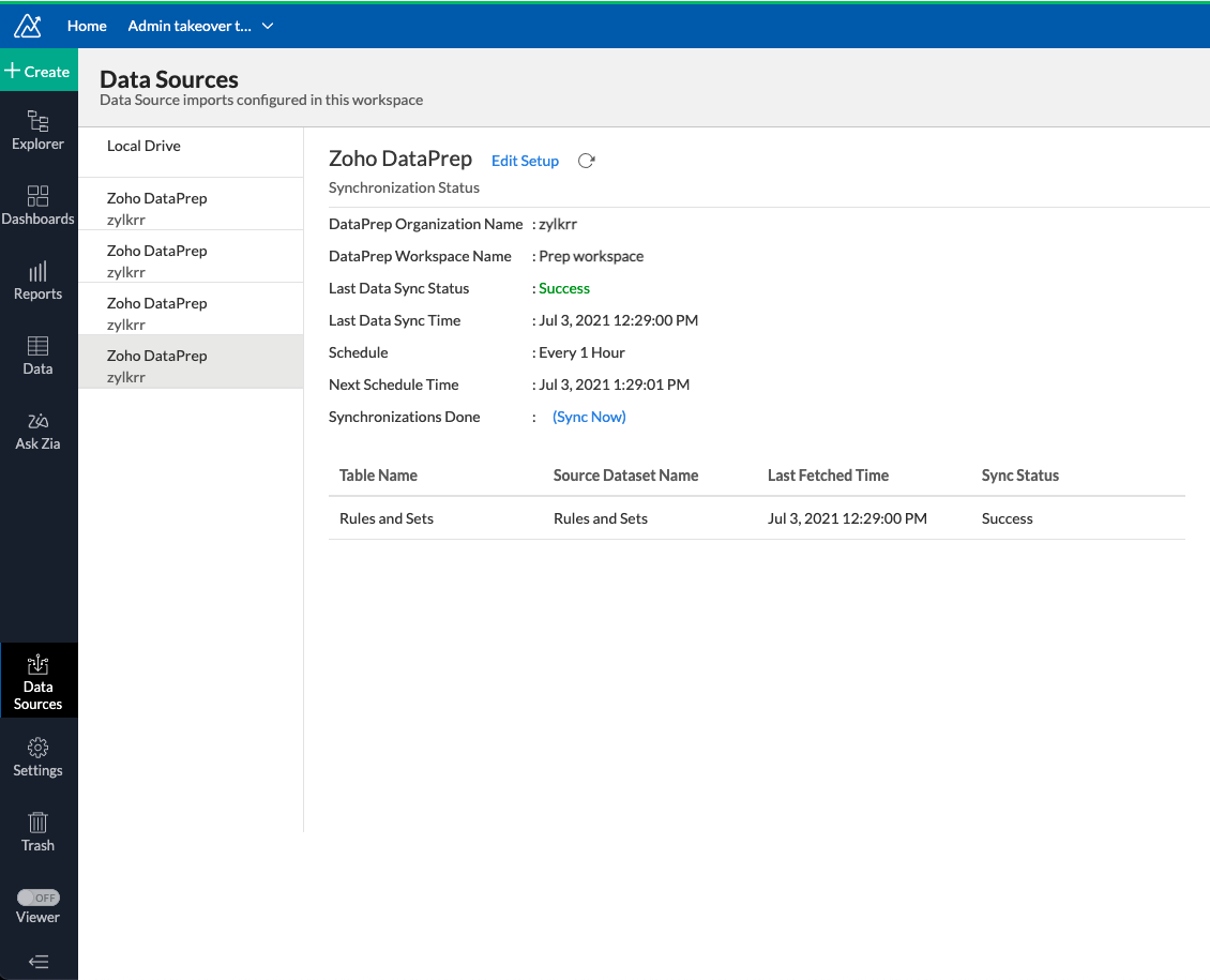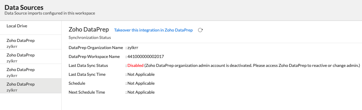 通常、Zoho DataPrepからZoho Analyticsへのエクスポートが正常にスケジュールされた場合は、下記の画面が表示されます。しかし、エクスポートするスケジュールを設定したユーザーがZoho DataPrep組織で削除または無効化されている場合、同期ステータスは無効となります。この場合、Zoho DataPrep で連携を引き継ぐリンクをクリックしてZoho DataPrep組織に移動し、スケジュールを引き継ぐことができます。