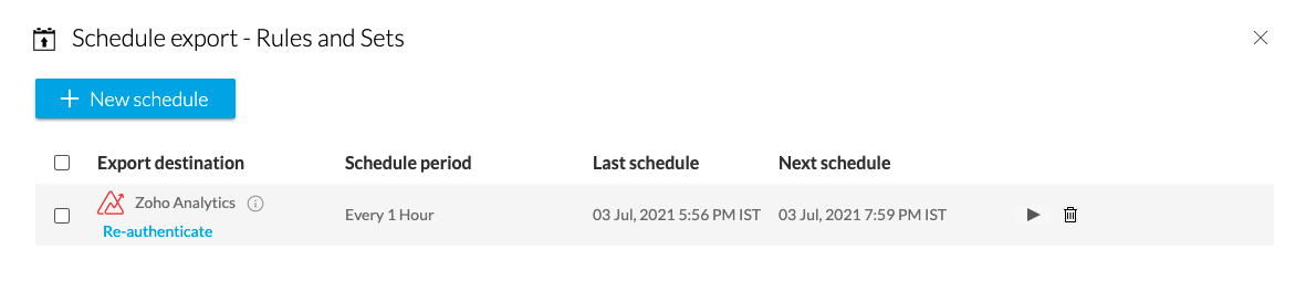 1. Zoho Analyticsワークスペースのデータソースセクションに移動し、引き継ぎたいインポートするスケジュールを選択します。例として、上記スクリーンショットのようにRules and Setsデータ元データセットのインポートがスケジュールされています。