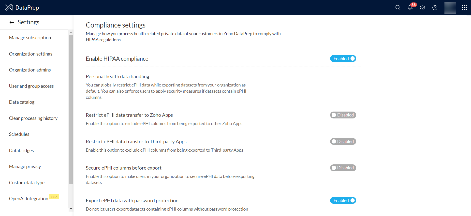 Zoho DataPrepはSOC2+HIPAAタイプ2に準拠しています。Zoho DataPrepは、顧客がDataPrepをHIPAA準拠で利用できるよう、以下の機能を提供しています。