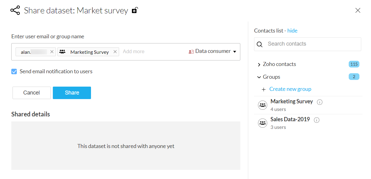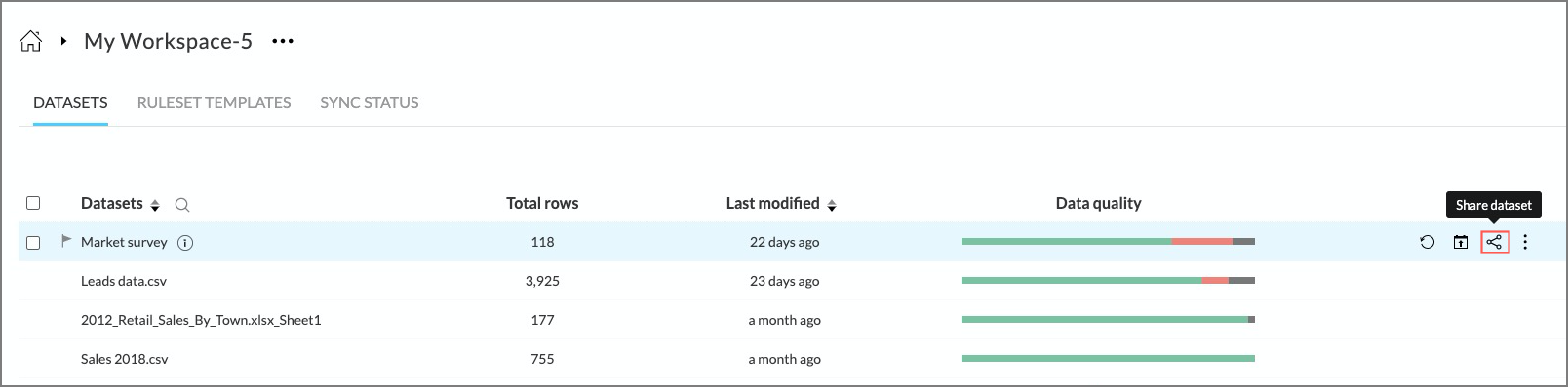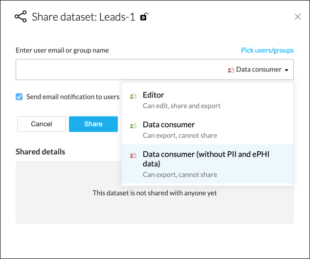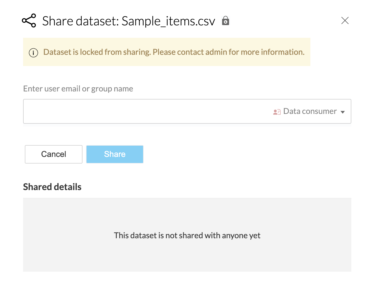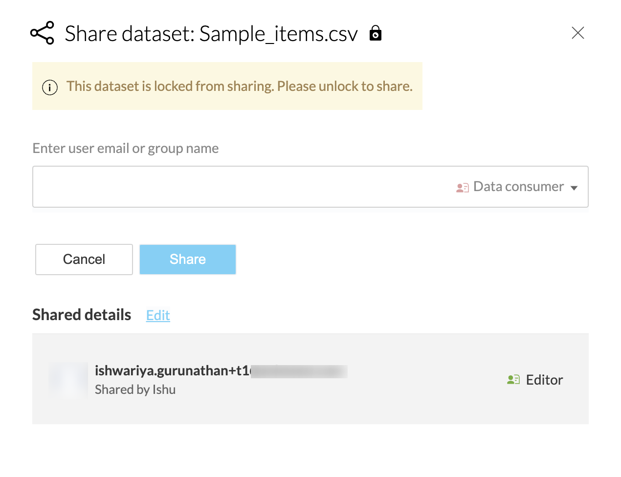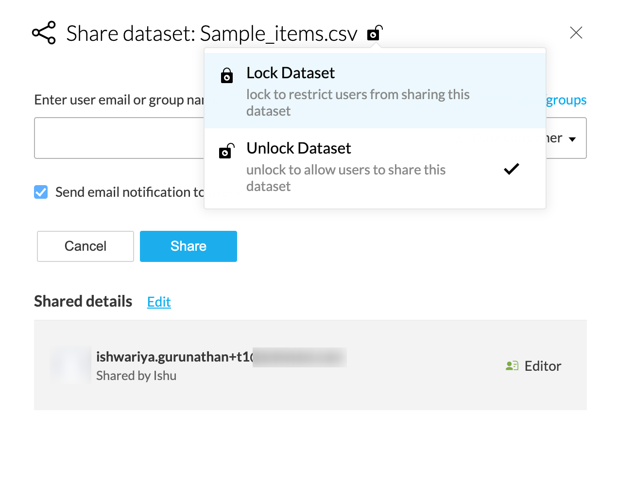 5. データセットのロックを解除するには、 をクリックし、 共有パネルでUnlock Datasetオプションを選択してください。データセットの共有ロックが解除されます。
