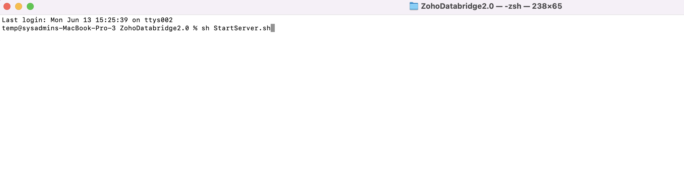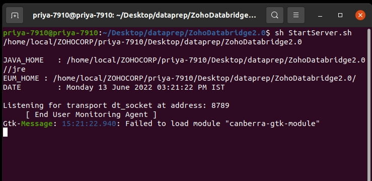Zoho Databridgeを閉じ、ターミナルでDatabridgeのインストール先に移動して、'sh StartServer。sh'コマンドを入力し、Databridgeを再開してください。