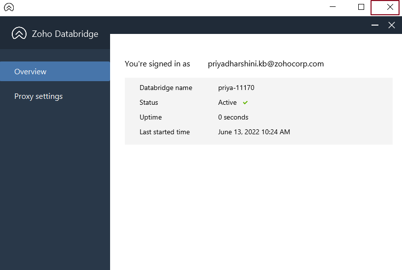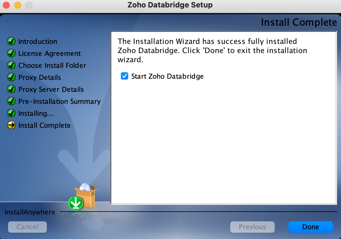 - Zoho Databridge のインストールが完了し、Zohoアカウントに登録されました。