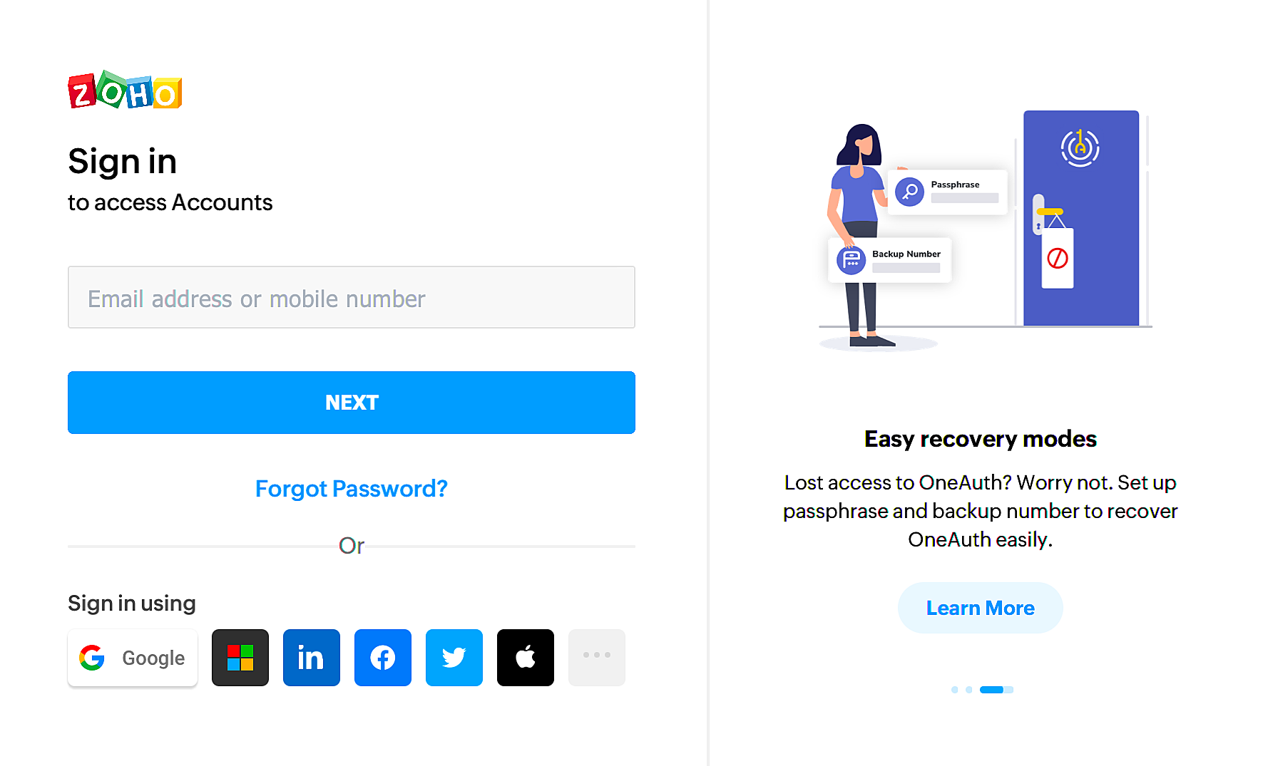 - Zoho アカウントのユーザー名とパスワードで Zoho Accounts にログインします。
