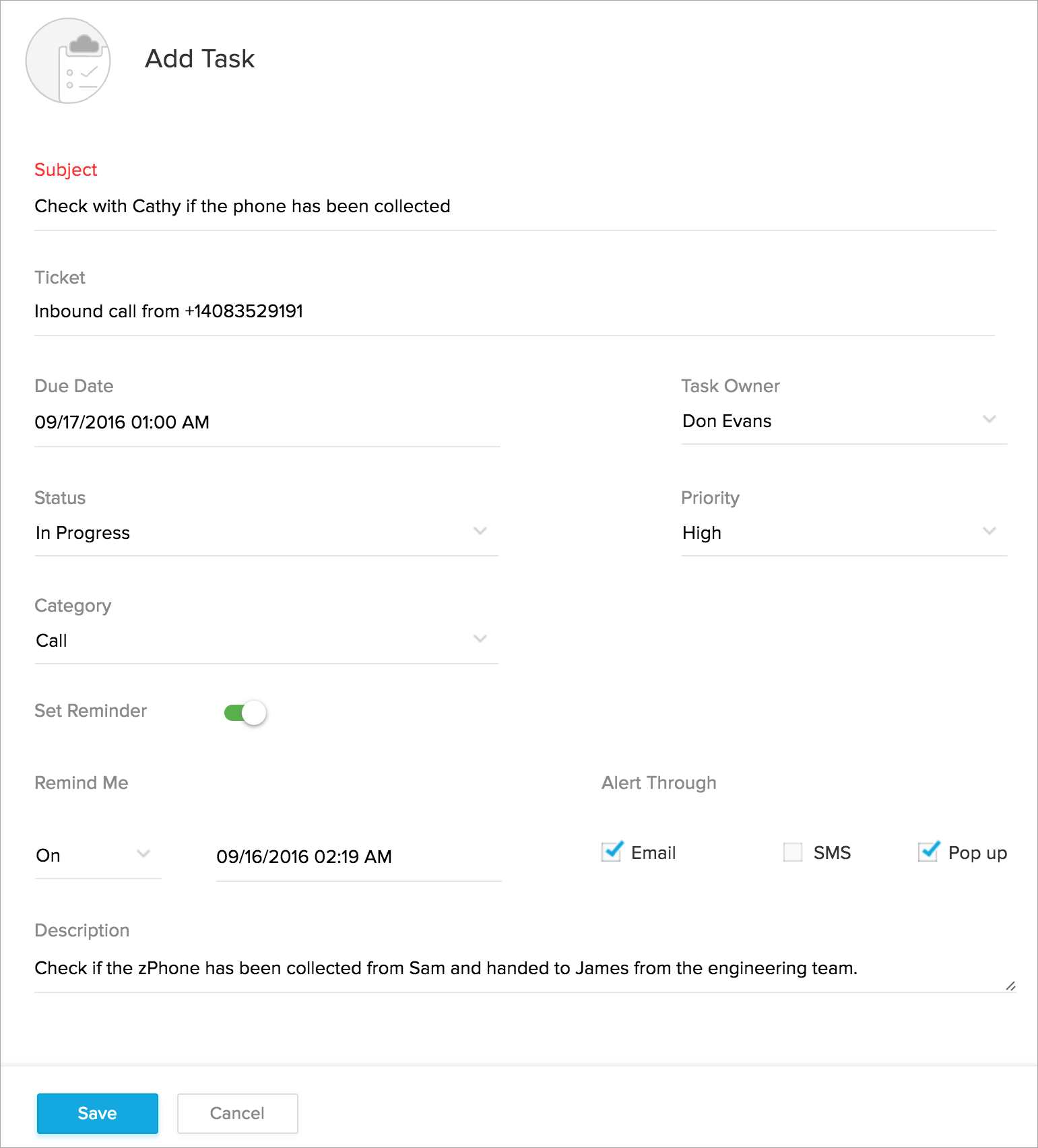 • 担当者が、手動でタスクを作成し、問い合わせと関連付けることができます。