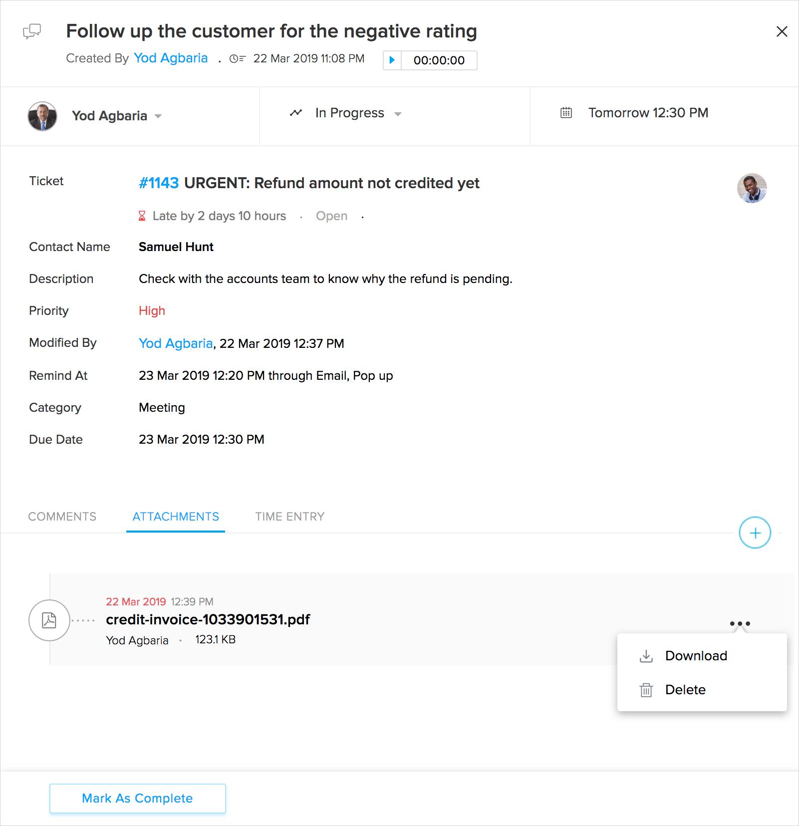 タスクの作成後、添付ファイルを追加できます。たとえば、担当者が問題や不具合を修正するのに役立つドキュメント、スクリーンショット、動画を添付できます。