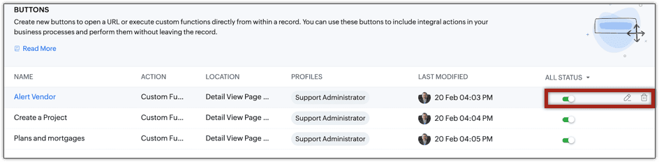 無効にするには、ボタンの一覧表示で対象のボタンの欄にある切り替えボタンをクリックします。無効にすると、問い合わせの詳細ページにそのボタンが表示されなくなります。同様に、ボタンは必要に応じて編集/削除できます。編集/削除するには、ボタンにカーソルを合わせ、編集/削除アイコンをクリックします。