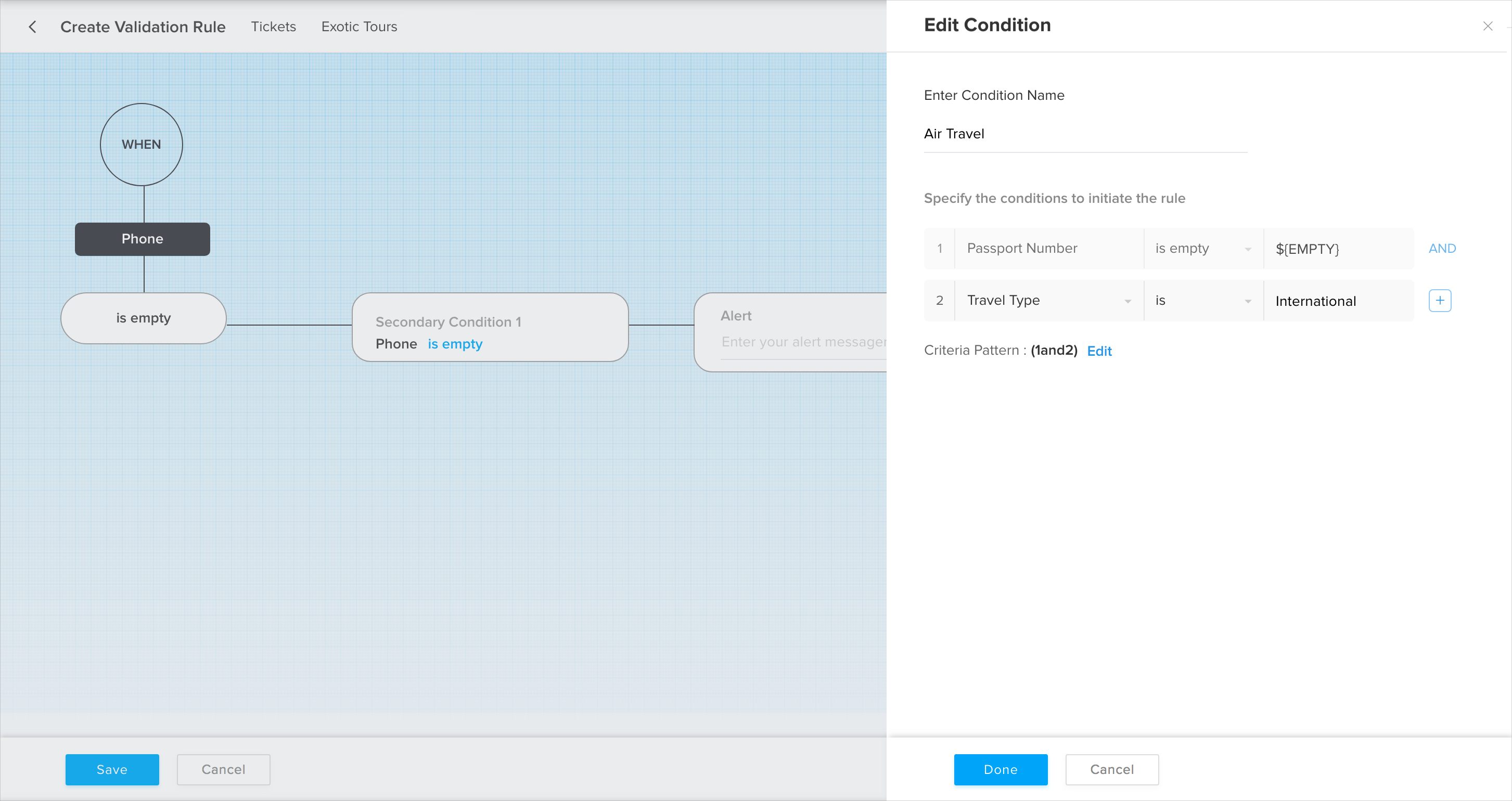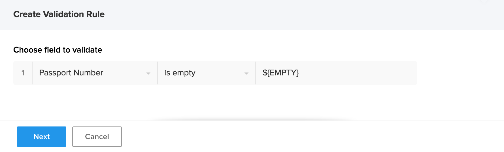 たとえば、旅行の種類が海外で、パスポート番号の項目を検証する場合、メインの条件は「パスポート番号[が空である]」になります。