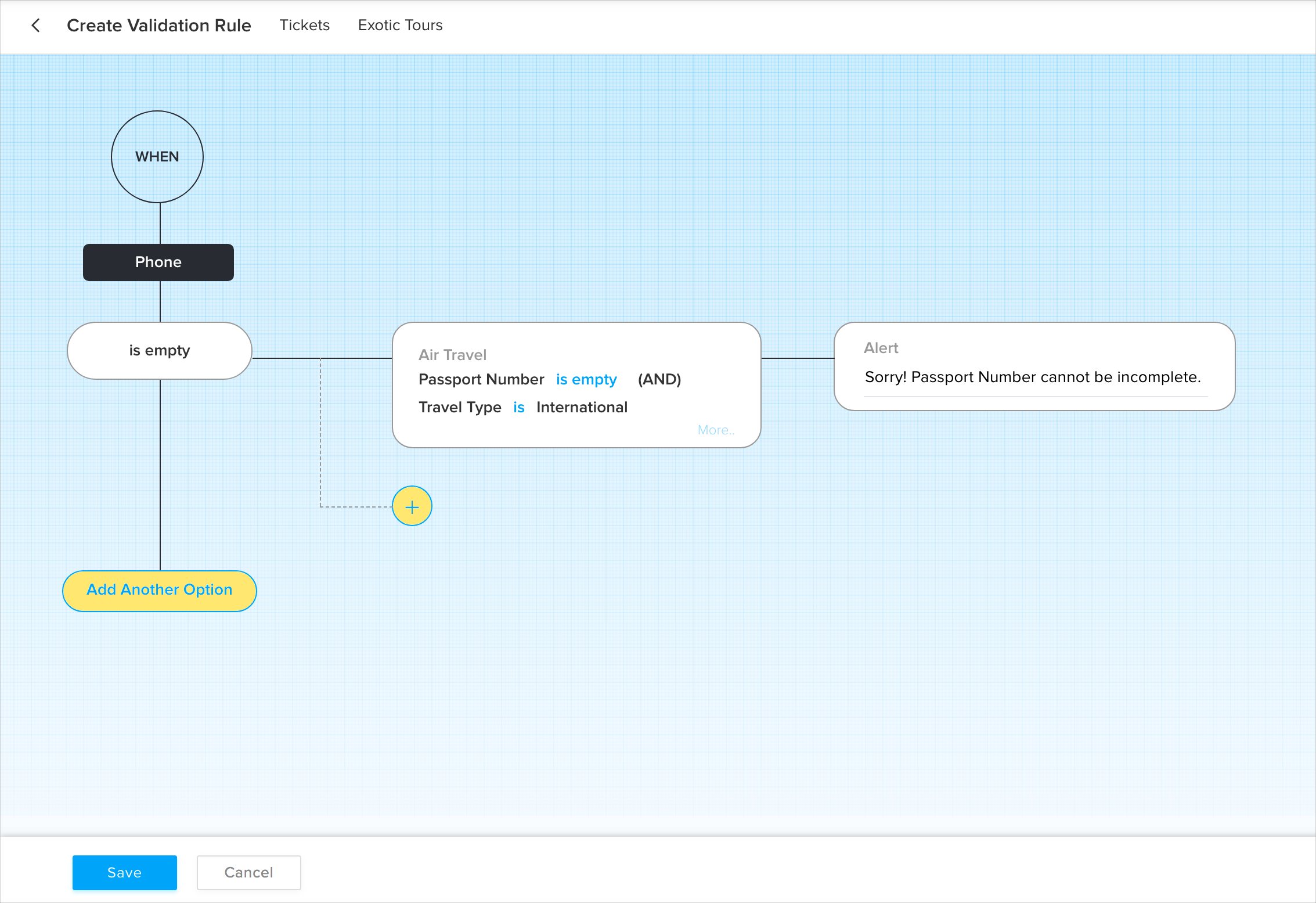 4. 旅行に関する情報を入力するWebフォームがあり、顧客の旅行の種類が「海外」の場合、旅行者のパスポート番号が必要だとします。Zoho Deskでこの入力規則を設定する場合、内容は以下のようになります: