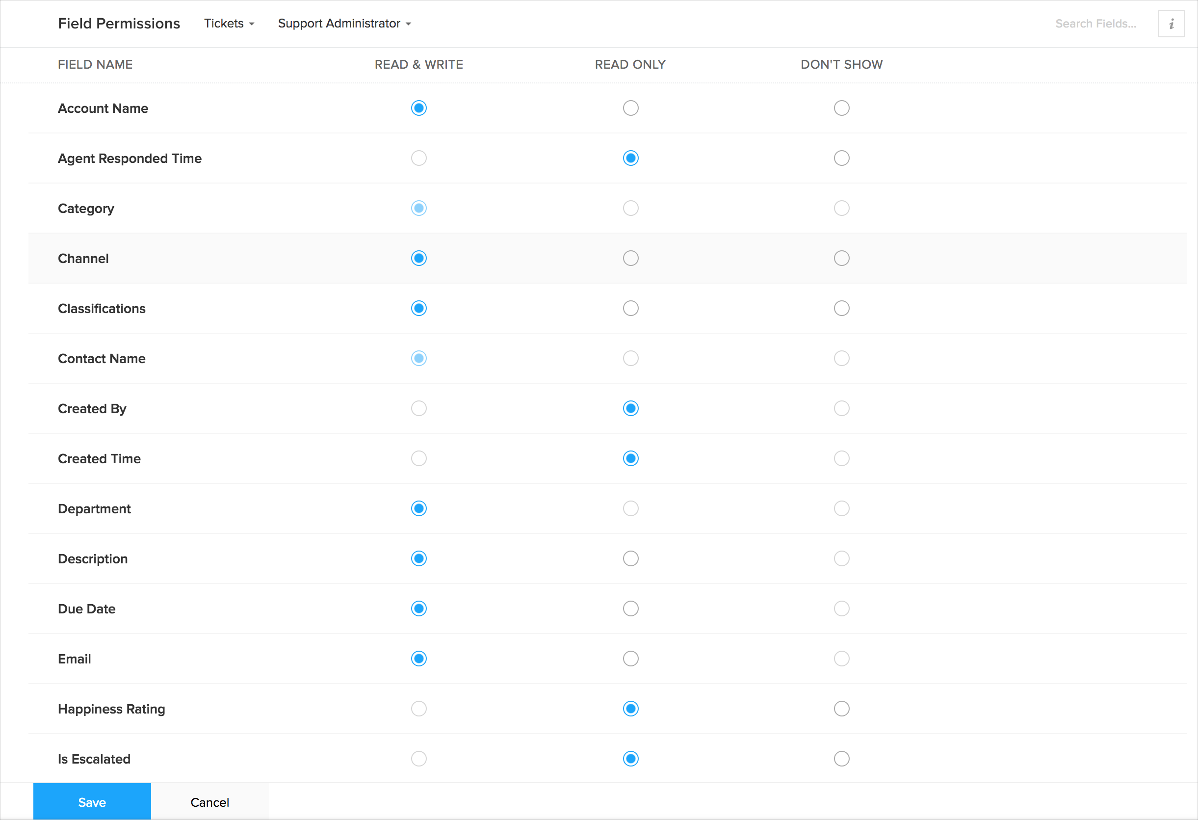 データのセキュリティは、ヘルプデスクソフトウェアにおいて最も求められている機能です。組織と顧客のビジネス上の機密情報を扱うことを考えれば、 タブ内の特定の項目への 担当者の アクセスを制限する場合もあるでしょう。たとえば、連絡先タブ内に顧客のクレジットカード情報などの機密情報が含まれる場合、特定の権限に対してこれらの項目を非表示にできます。あるいは、該当の情報の編集を制限したい場合は、表示専用の権限を付与することもできます。項目レベルのセキュリティ対策として、さまざまな権限に対して、ヘルプデスク項目へのアクセス権限を設定できます。この機能を使用すると、ユーザーの業務上の必要性に合わせて、項目へのアクセス権限を許可できるため、項目レベルのセキュリティを容易に確保できます。必要に応じて、必須項目以外のすべての項目の表示/編集権限を、有効化/無効化できます。