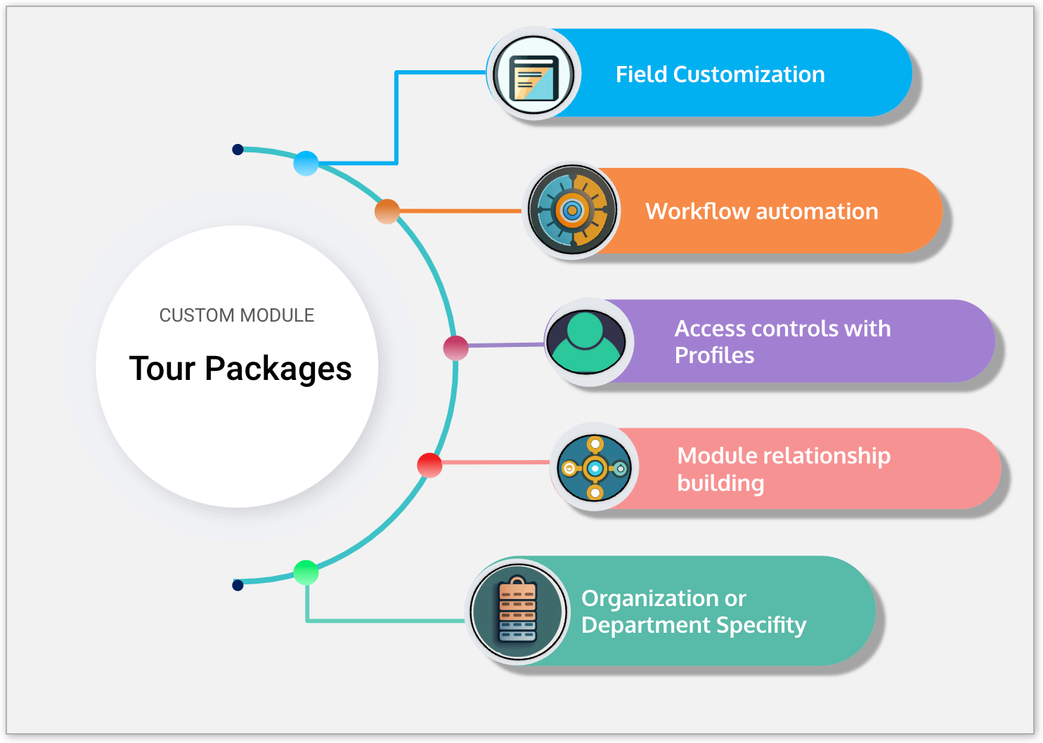 タブの権限を設定すると、特定の権限を持つユーザーのみがタブ内のデータを表示、編集できるようにすることが可能です。たとえば、[パッケージツアー]、[宿泊先]、[交通機関]の3つのカスタムタブを作成したとします。パッケージツアー、宿泊先、交通機関の予約をそれぞれ別のチームが担当している場合、タブの権限を指定し、各タブの業務を担当するチームのユーザーのみが対象のタブにアクセスできるように設定することが可能です。