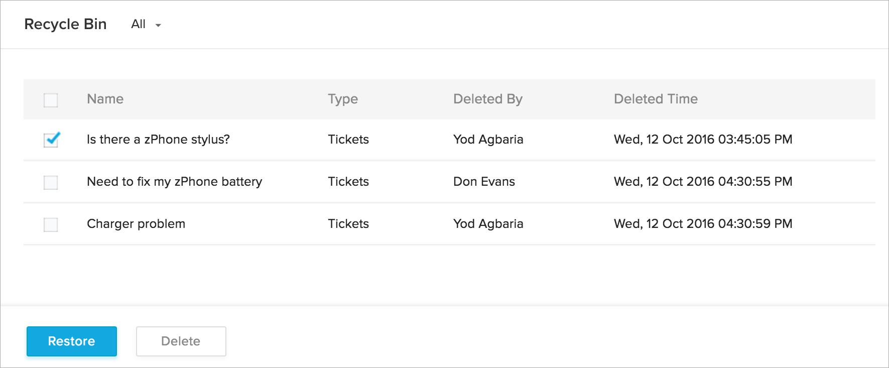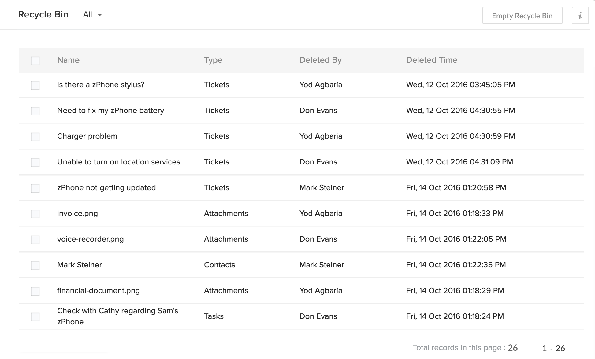 ごみ箱には、Zoho Deskのアカウントで削除されたすべてのデータやファイルが保管されています。ごみ箱内のデータは60日間保存され、その期間を過ぎるとZoho Deskのアカウントから完全に削除されます。