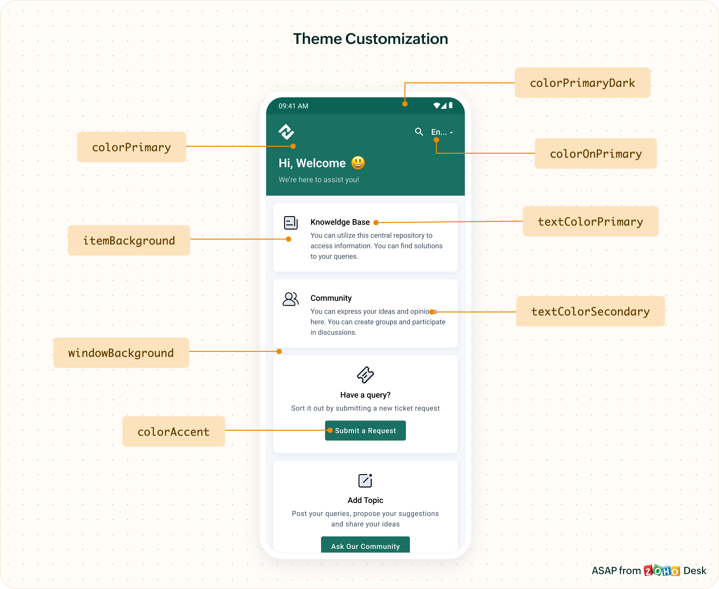 ZDPortalConfiguration.setThemeResource(themeId); | ZDPortalConfiguration.setThemeType(ZDPThemeType.LIGHT); ZDPortalConfiguration.setThemeBuilder(new ZDPTheme.Builder(false) .setColorPrimary(getResources().getColor(R.color.colorPrimary)) .setColorPrimaryDark(getResources().getColor(R.color.colorPrimaryDark)) .build()); |