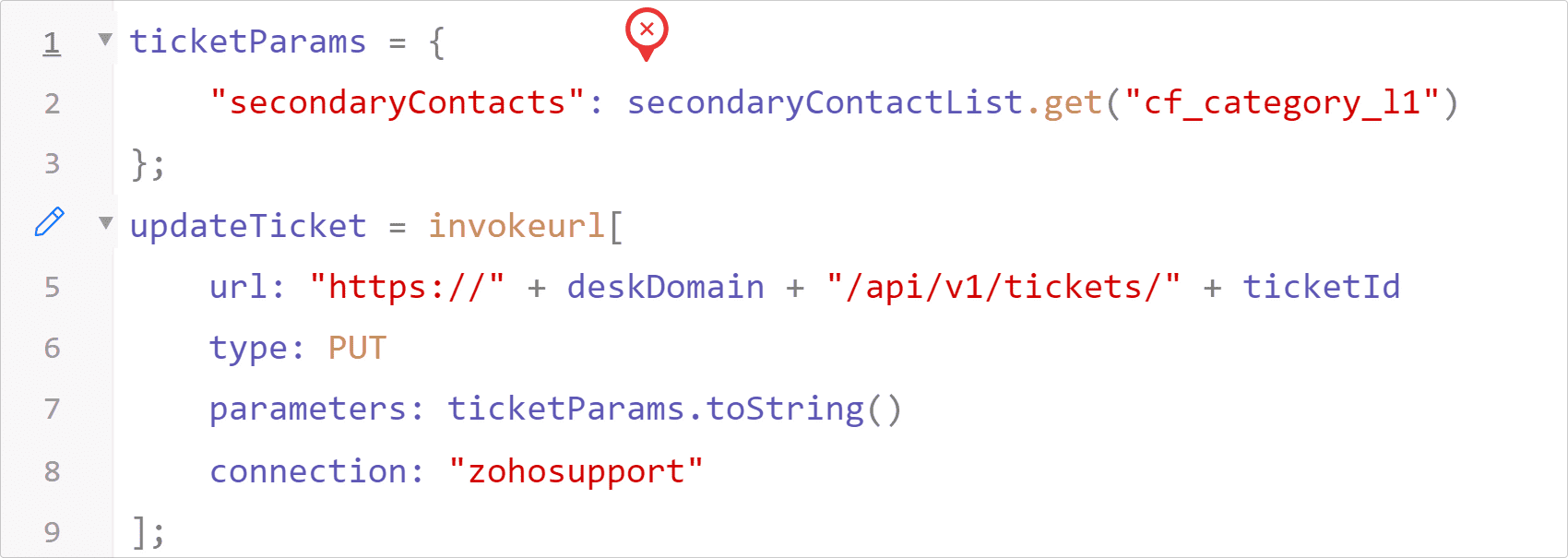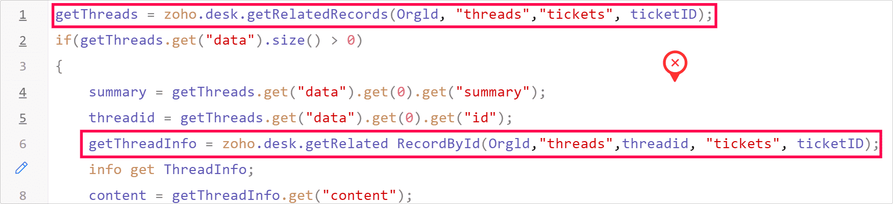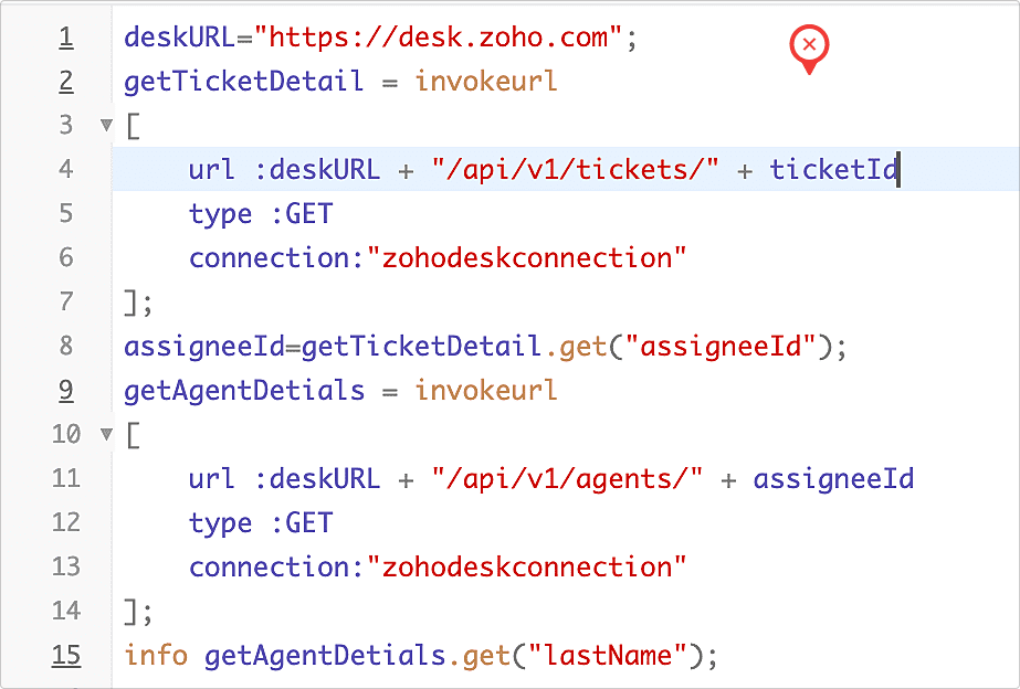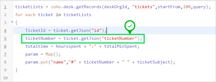 たとえば、Zoho Deskの問い合わせの一覧を取得するためのAPI(ticketList)を実行するとします。また、各問い合わせのデータを参照して、データID(パラメーター名:ticketId )を取得するとします。その後の処理で、データIDとは別に問い合わせ番号を使用したい場合、あらためてAPIを実行するのではなく、取得済みのデータの中から問い合わせ番号の項目(パラメーター名:ticketNumber)を参照することで、APIを再実行しなくても必要な値を取得できます。以下の画像は、不十分なコードと適切なコードの例です。