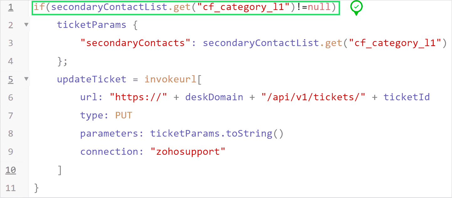 たとえば、Zoho Deskのカスタム項目の値を取得して使用する場合、該当のカスタム項目に値が入っているかどうかを確認することで、以降の処理を適切に進めることが可能です。なお、Zoho Deskのカスタム項目を取得する際には、「cf_category」から始まるラベルを使用します。以下が具体例で、1つ目の画像は不十分なコード、2つ目の画像は適切なコードの例です。