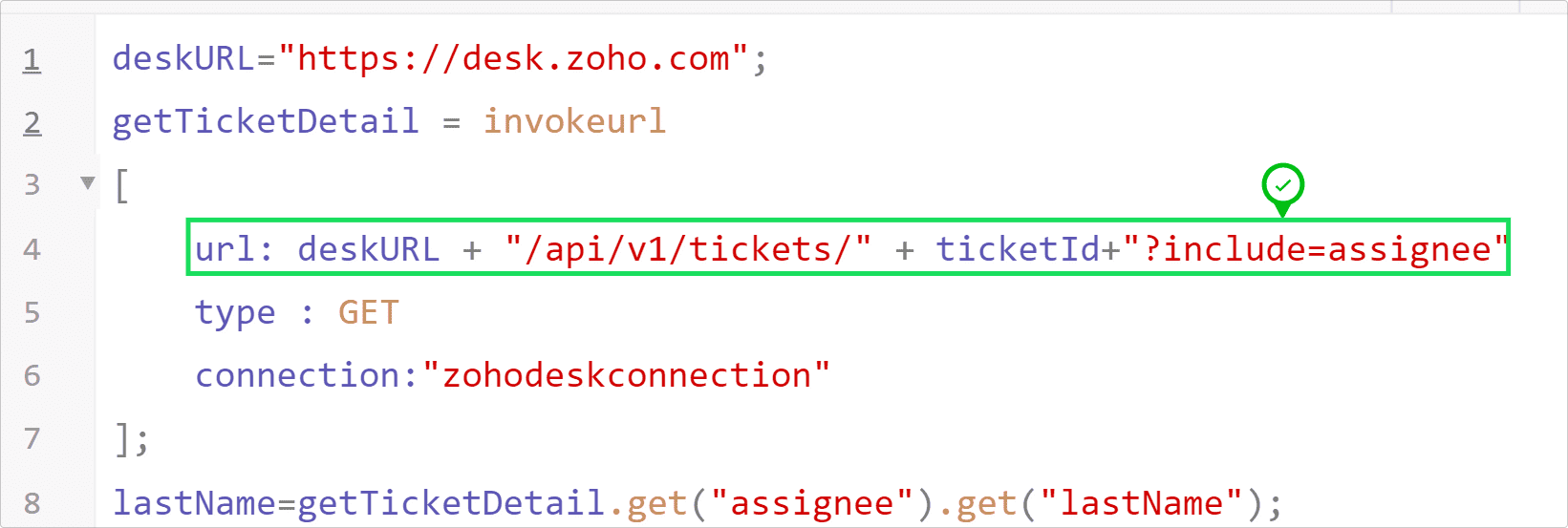 ある処理の中で、問い合わせの担当者のID(パラメーター名:assigneeId)と担当者の姓(パラメーター名:lastName)を参照したいとします。通常、問い合わせの詳細を取得するためのAPIでは担当者のIDしか取得できないため、そのIDをもとに担当者の詳細を取得するためのAPIを別途実行し、姓の情報を取得する必要があります。ここで、最初のAPIを実行する際に、「include」というパラメーターを追加することで、担当者の詳細情報もあわせて取得しておくことが可能です。これにより、問い合わせの詳細と担当者の詳細を別々に取得してAPIを2回実行する必要がなくなり、1回実行するだけで必要な情報をまとめて取得できます。APIにおける「include」パラメーターの詳細はこちら