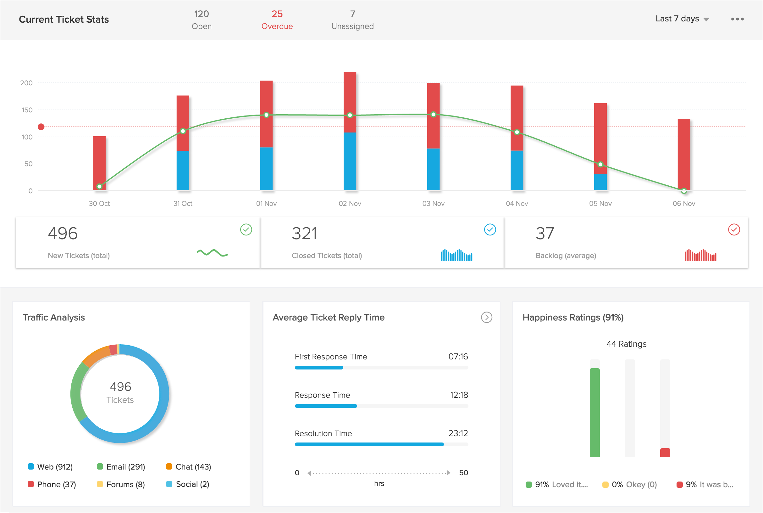 ダッシュボードの上部では、Zoho Deskでの問い合わせに関する統計データを確認できます。