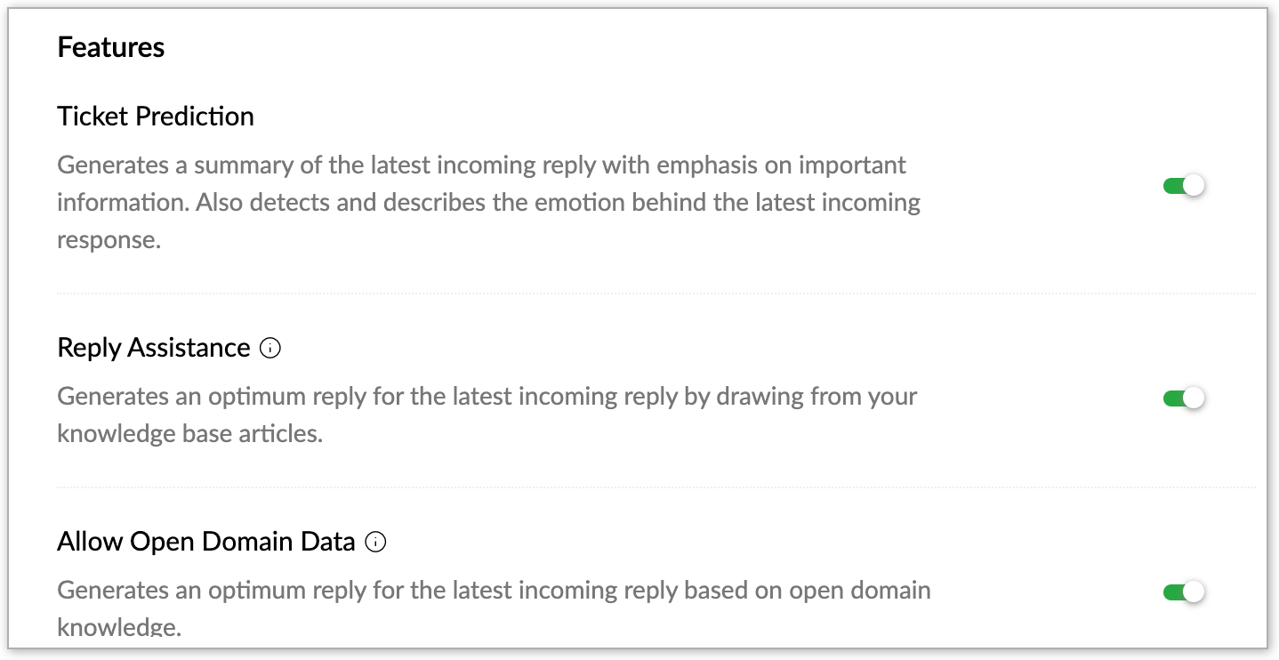 規約同意のチェックボックスを選択し、表示された画面で[Proceed](続ける)をクリックします。 - 必要に応じて、[Ticket Prediction](問い合わせの分析)、[Reply Assistance](返信アシスタント)、[Allow Open Domain Data](インターネット上の公開情報の利用を許可する)の各設定を有効にします。