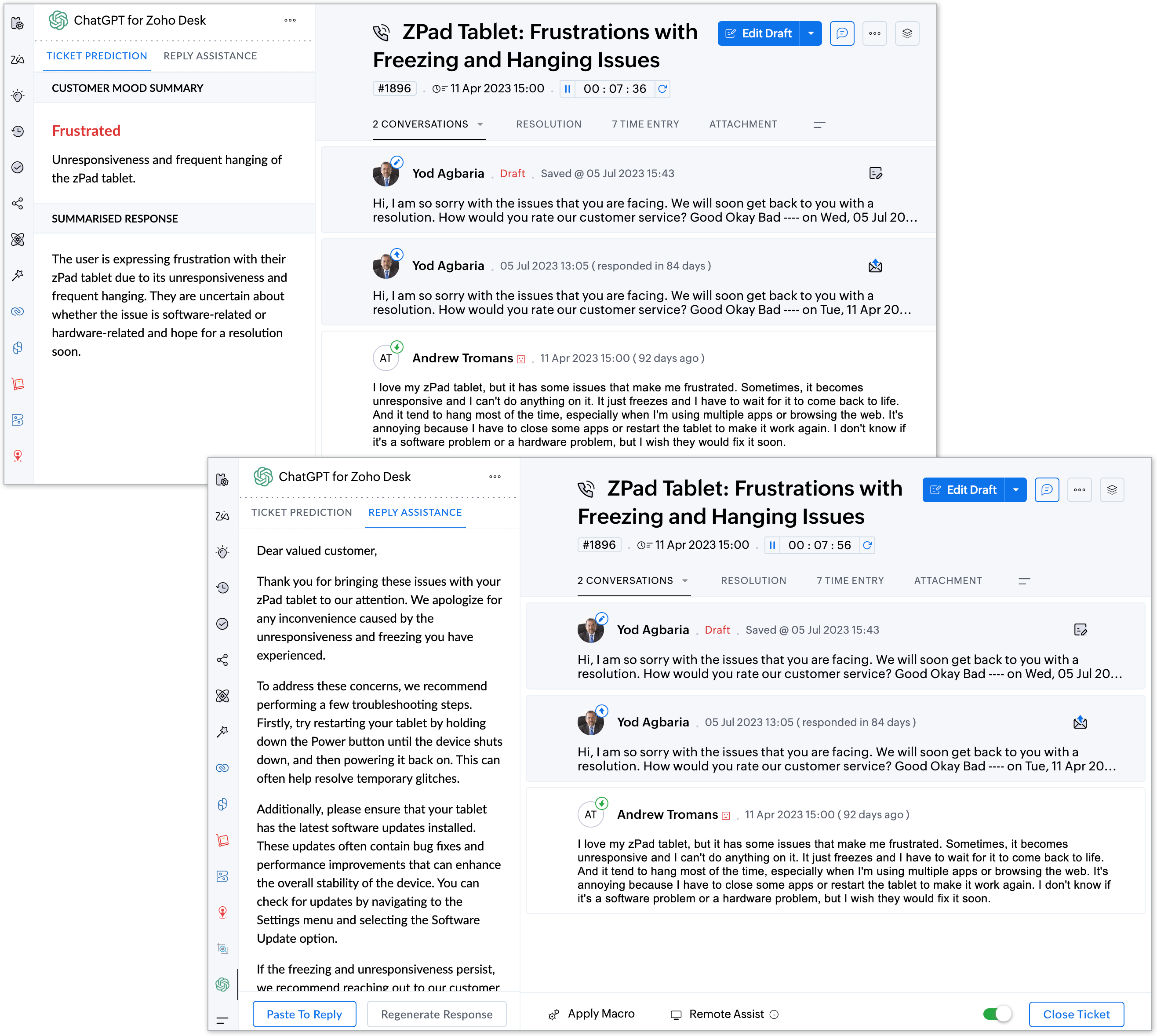 こちらの記事でご紹介するChatGPT for Zoho Desk拡張機能では、AIが問い合わせの要約、感情の分析、返信の草案作成を行います。これにより、サポート担当者は、問い合わせ内容や顧客の感情をすばやく理解できるだけでなく、返信の作成時間を短縮することが可能です。