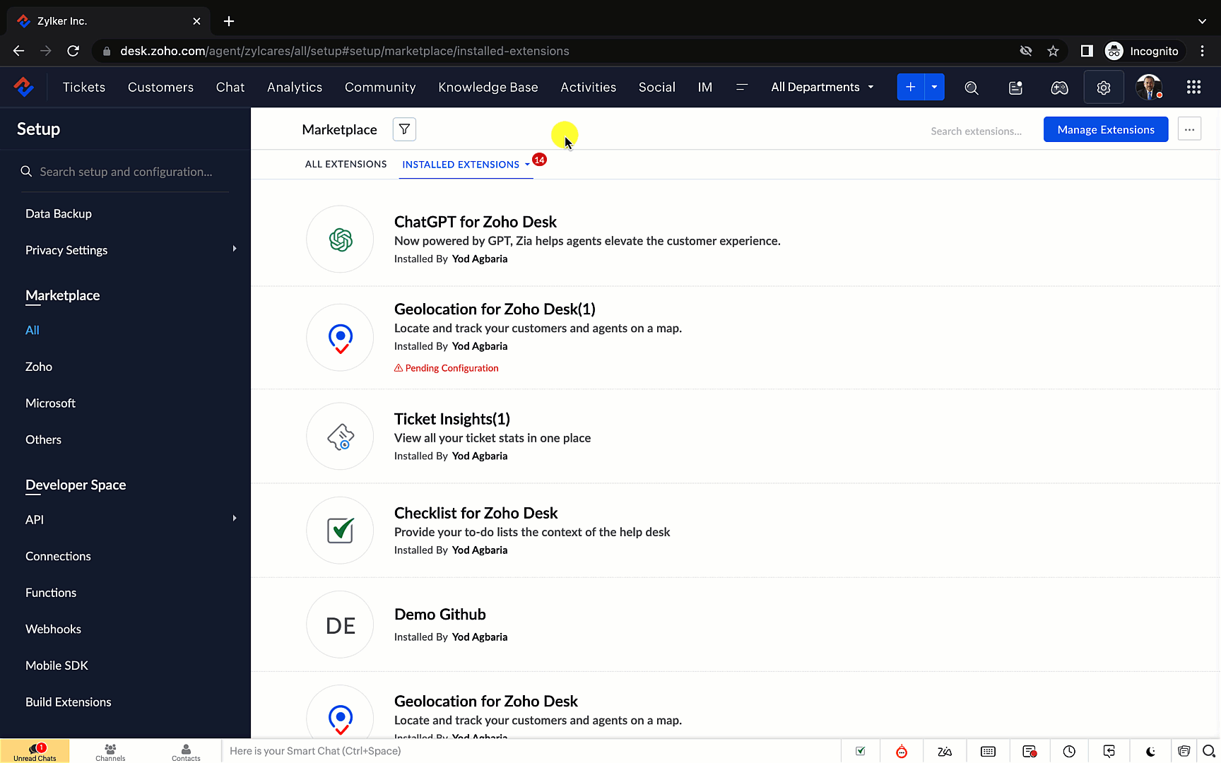 Zoho Deskの組織の管理者は、ChatGPT for Zoho Desk拡張機能をマーケットプレイスまたはZoho Deskアカウントからインストールできます。