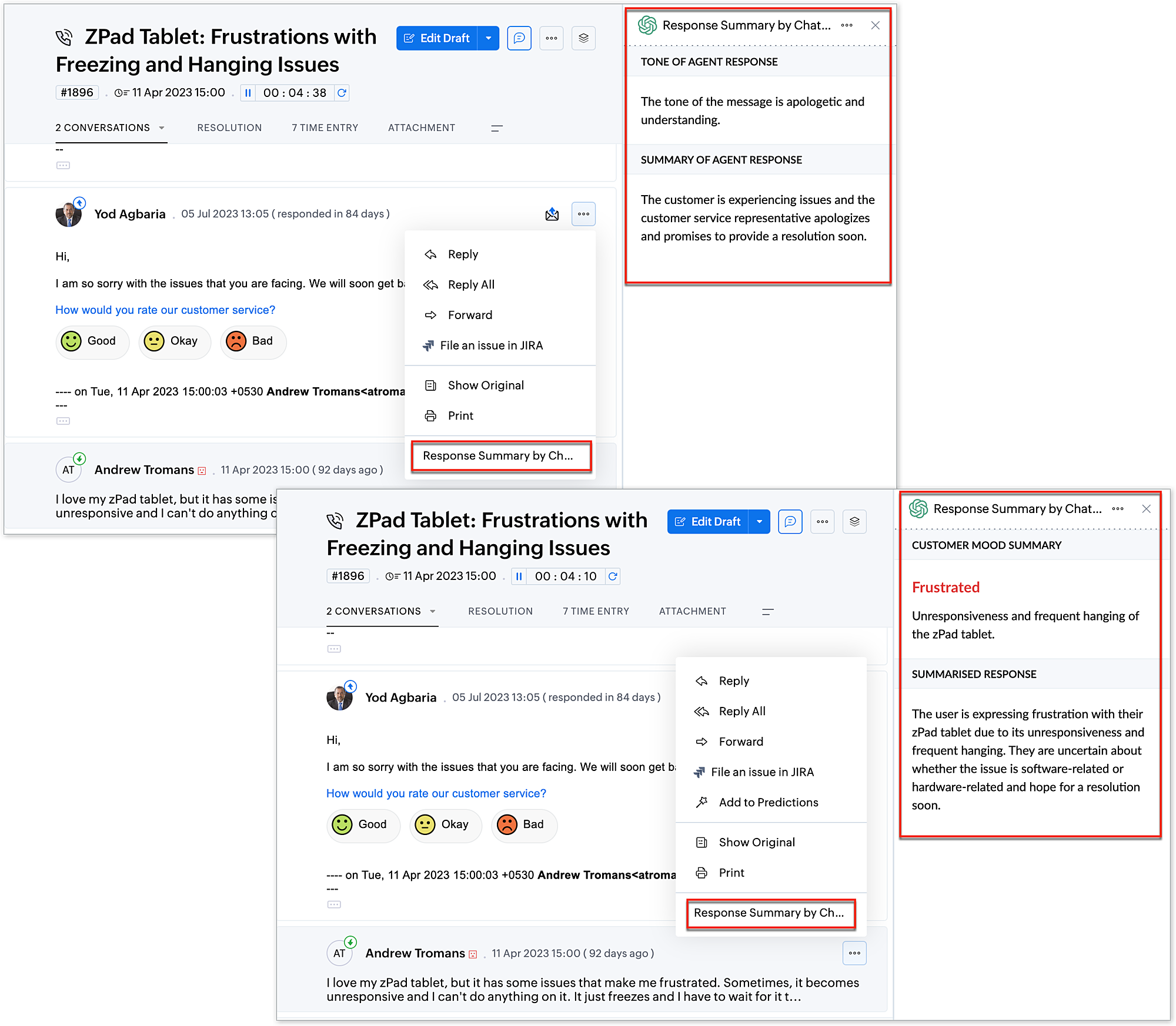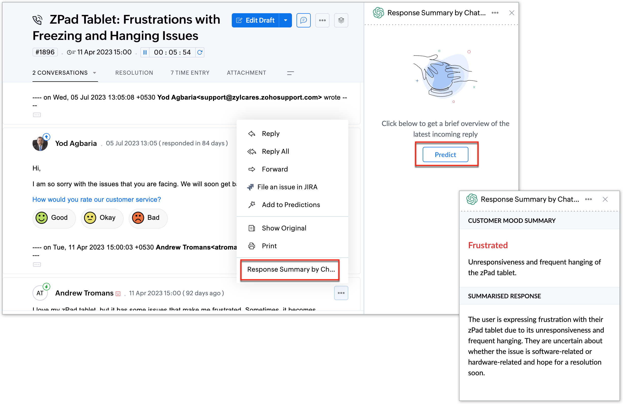 たとえば、ある企業に対して顧客から複雑な内容の問い合わせが寄せられたとします。問い合わせには、問題の詳細や顧客からの要望などが長々と記載されています。ここで、ChatGPT for Zoho Desk拡張機能を利用すると、複雑な問い合わせであっても、問い合わせ内容と顧客の感情をすばやく理解することが可能です。