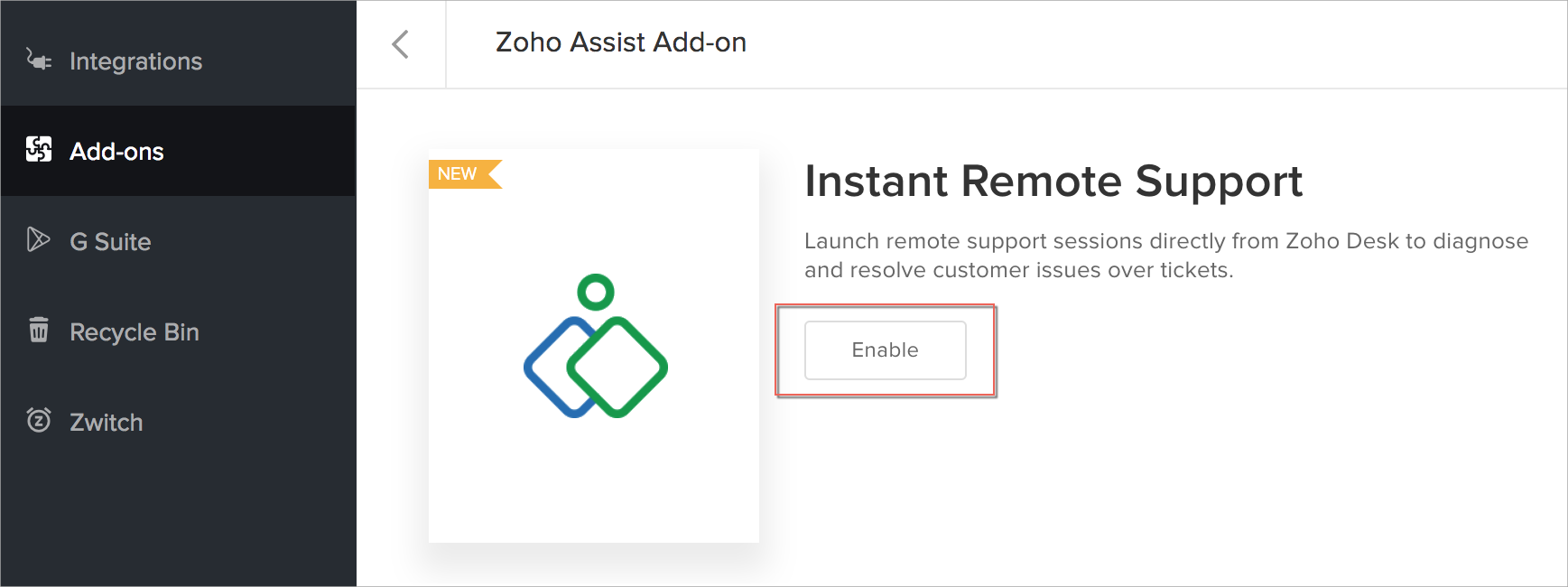 4. Zoho Assist アドオンページで、有効にする]をクリックします。