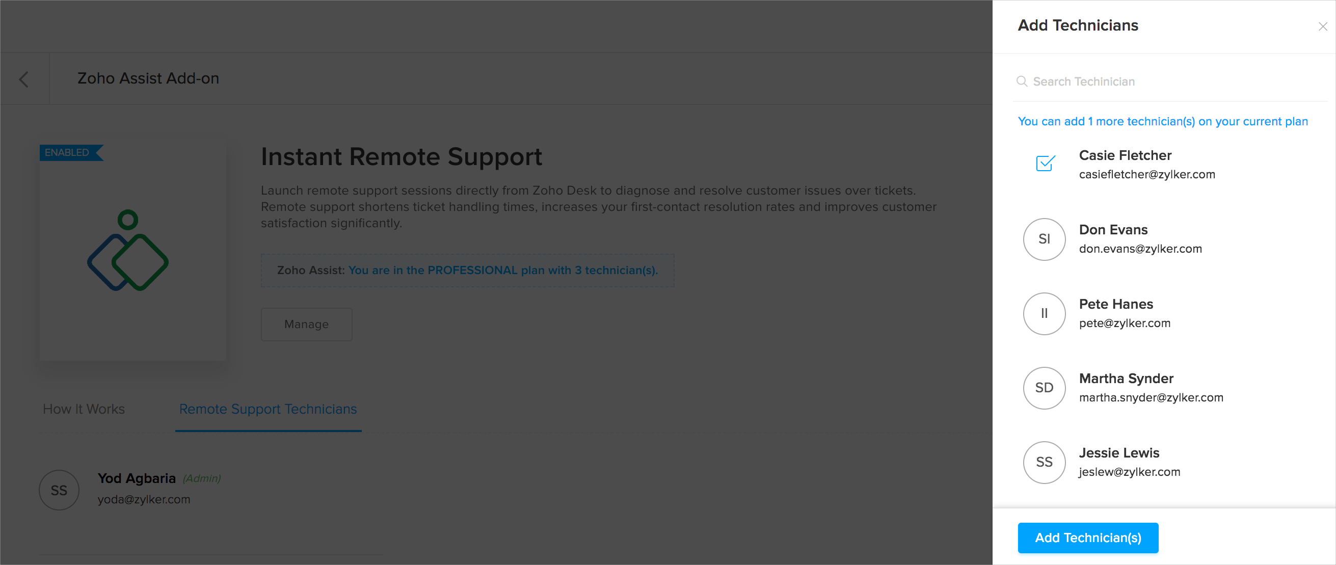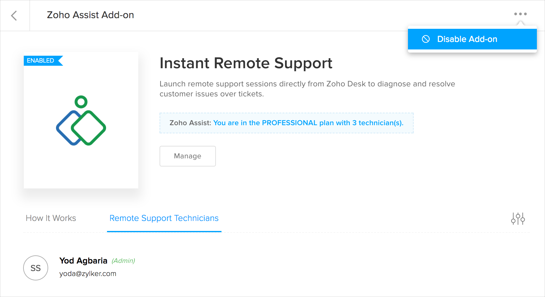 1. Zoho Assistアドオンページで、リモートサポート技術者]タブをクリックします。