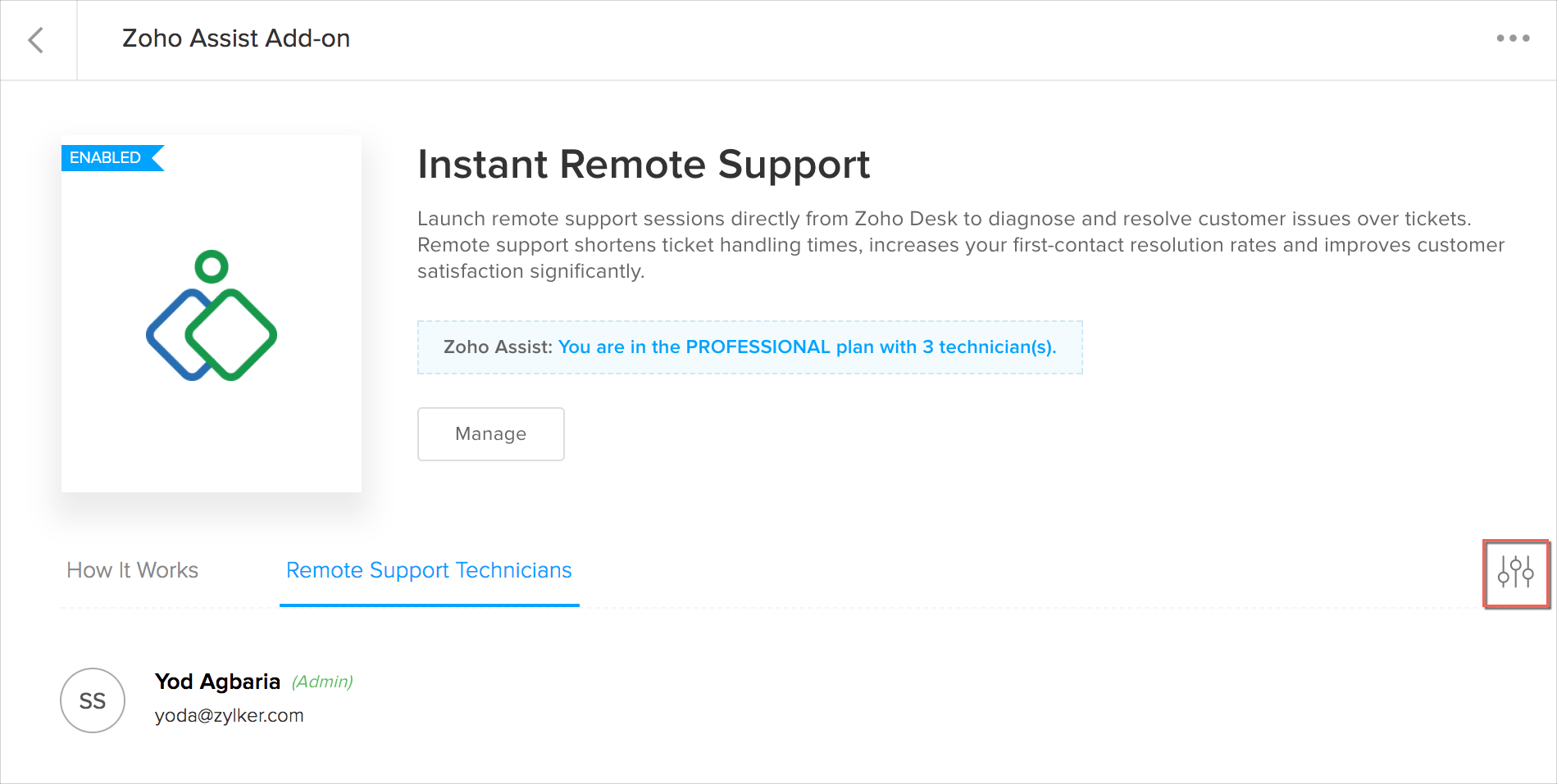 1. Zoho Assistアドオンページにある技術者の管理アイコン()をクリックします