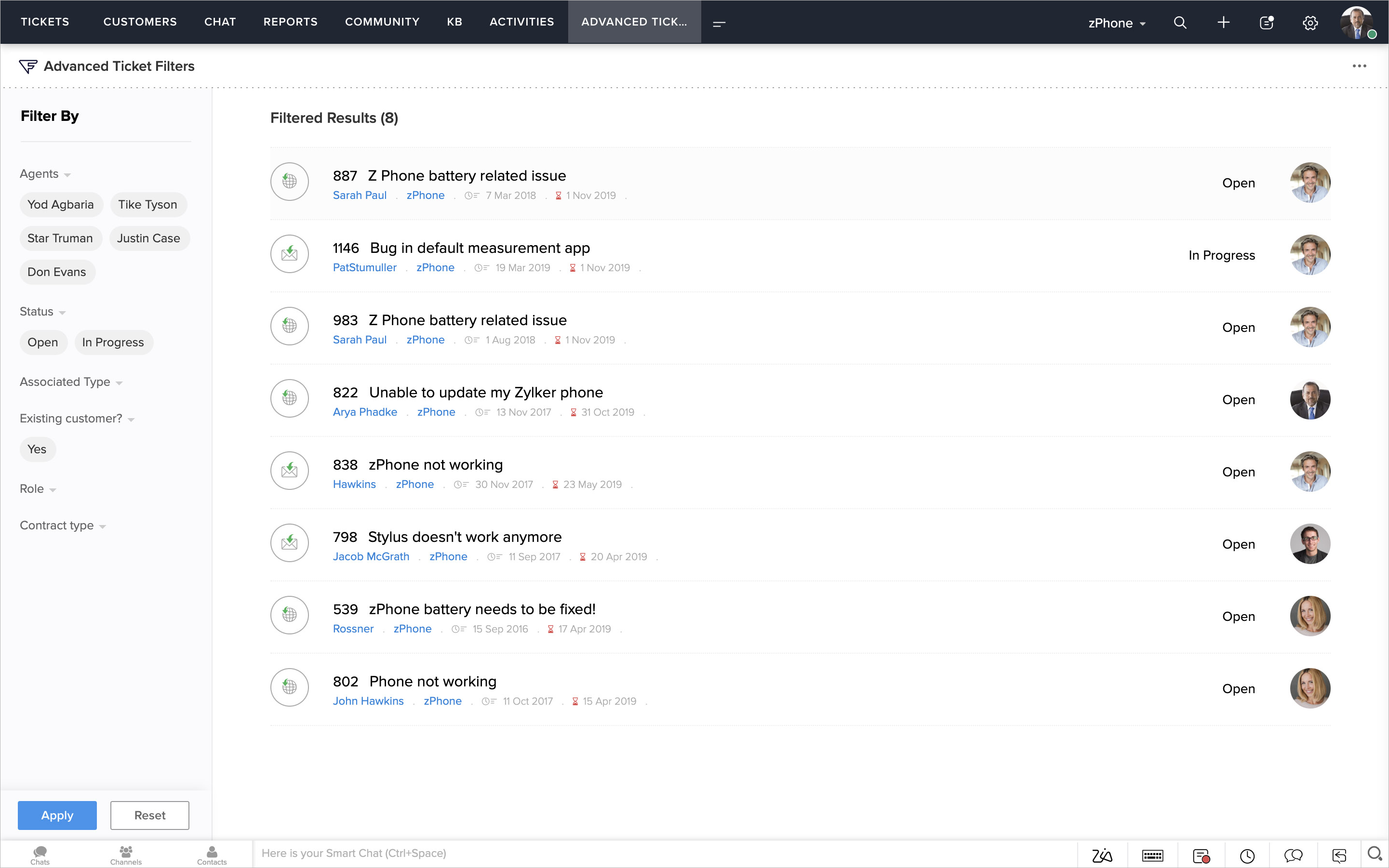 通常、顧客サポート業務ではさまざまな顧客からの問い合わせに対応します。これらの顧客からの問い合わせを効率よく管理するために、独自の項目や値を設定している組織も少なくありません。このような場合、特定の条件を満たすデータのみを抽出して表示するには手間がかかります。Zoho DeskのAdvanced Ticket Filters拡張機能を利用すると、詳細なフィルター条件を適用して簡単に問い合わせのデータを抽出できます。組織で独自に設定した項目や値を基にフィルターを適用したり、複数の条件を同時に選択してフィルターを適用したりすることが可能です。フィルターの適用後、該当の問い合わせをクリックすると、新しいブラウザーのタブから問い合わせの詳細情報を確認できます。