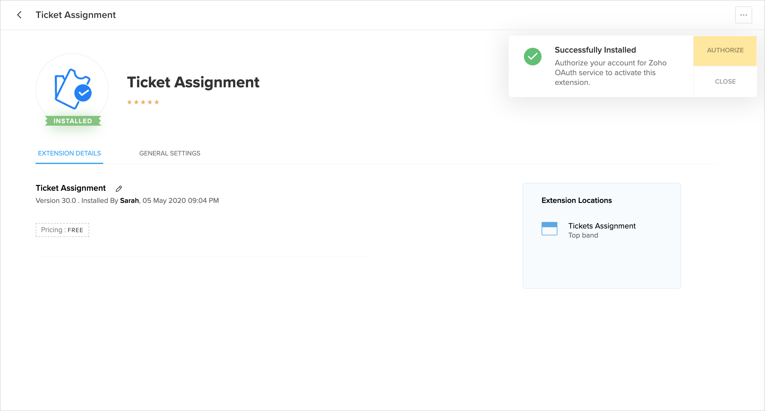 Ticket Assignment拡張機能は、Zoho Marketplace、または、Zoho Deskアカウントからインストールできます。