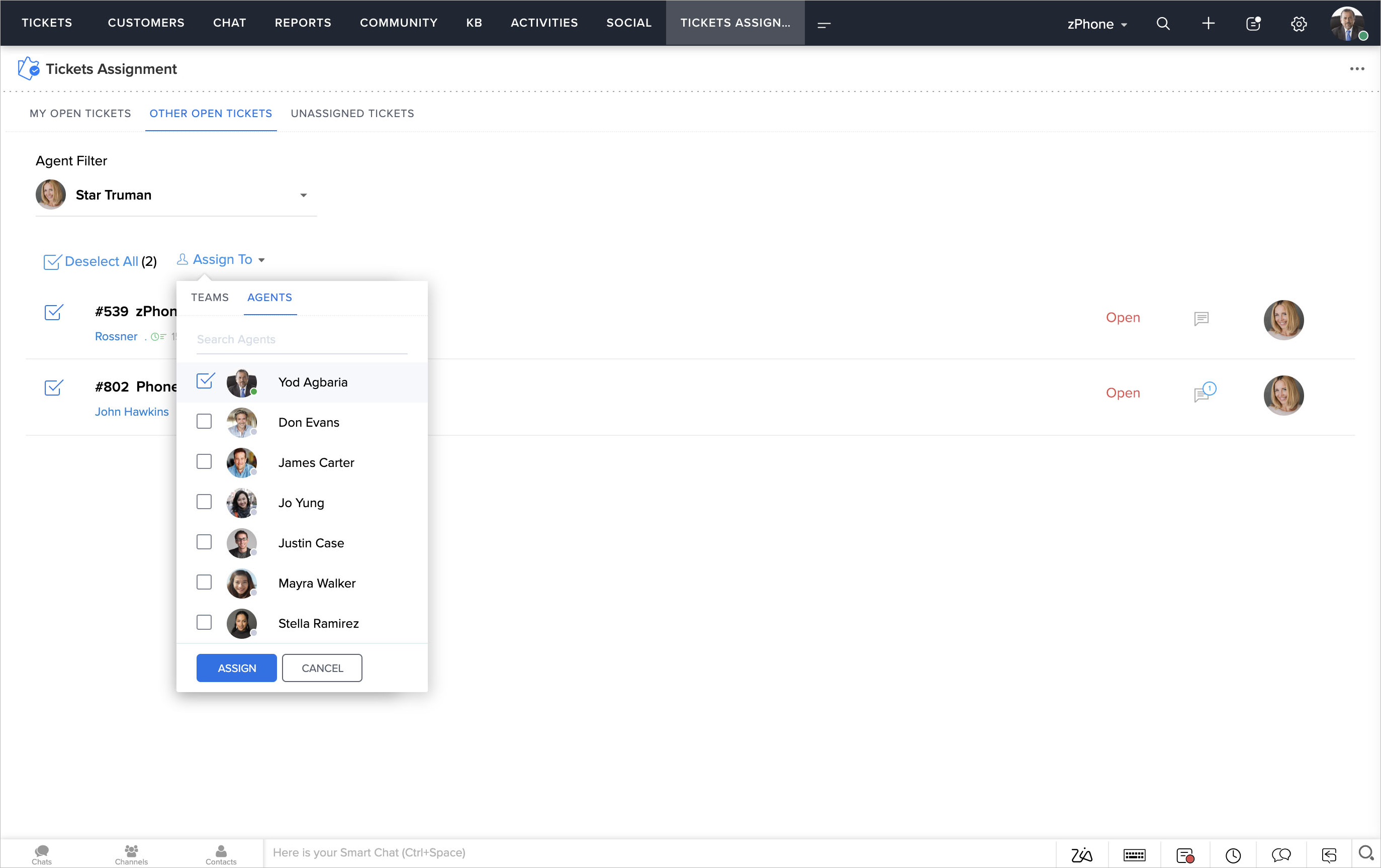 選択した問い合わせが担当者またはチームに割り当てられます。