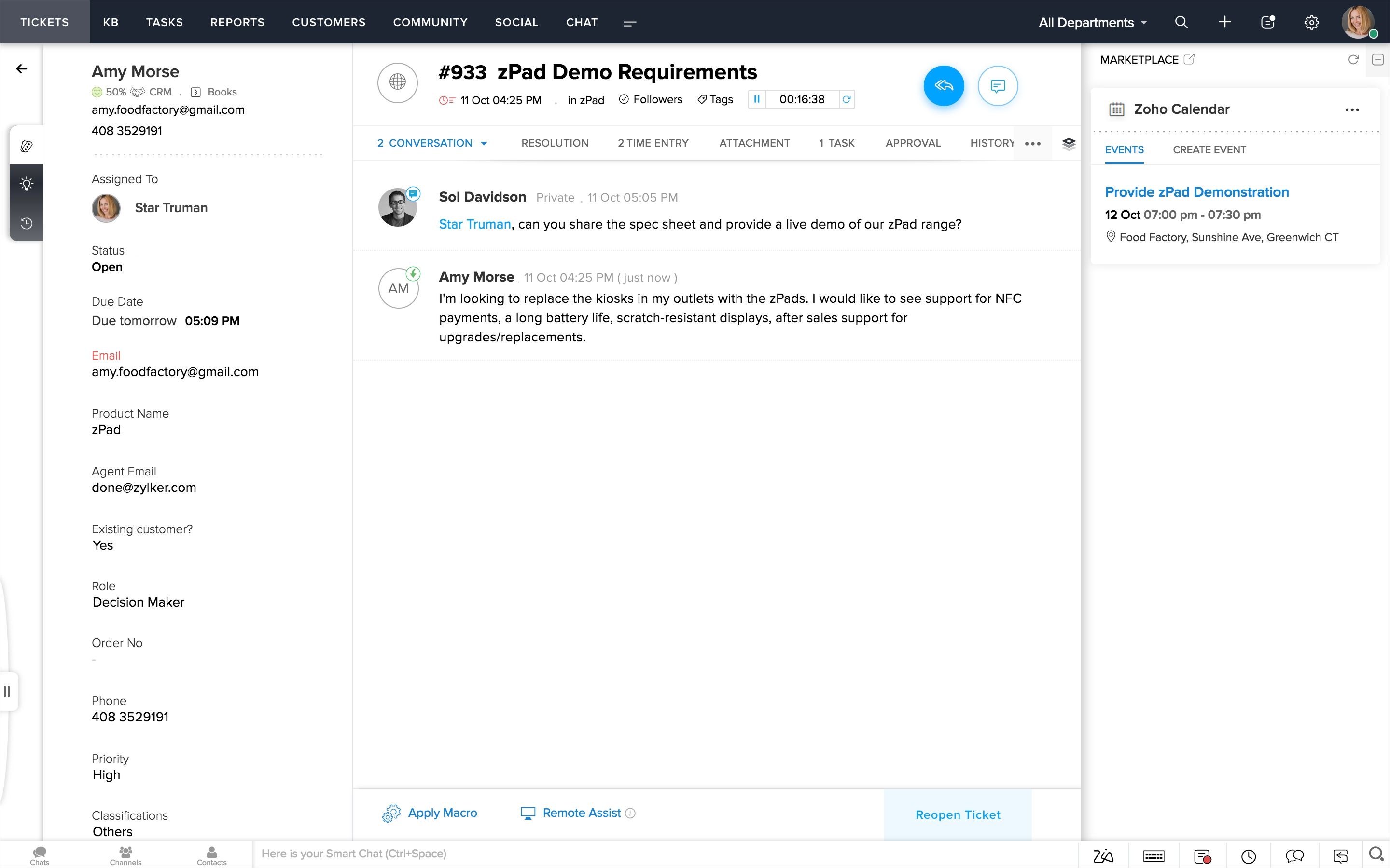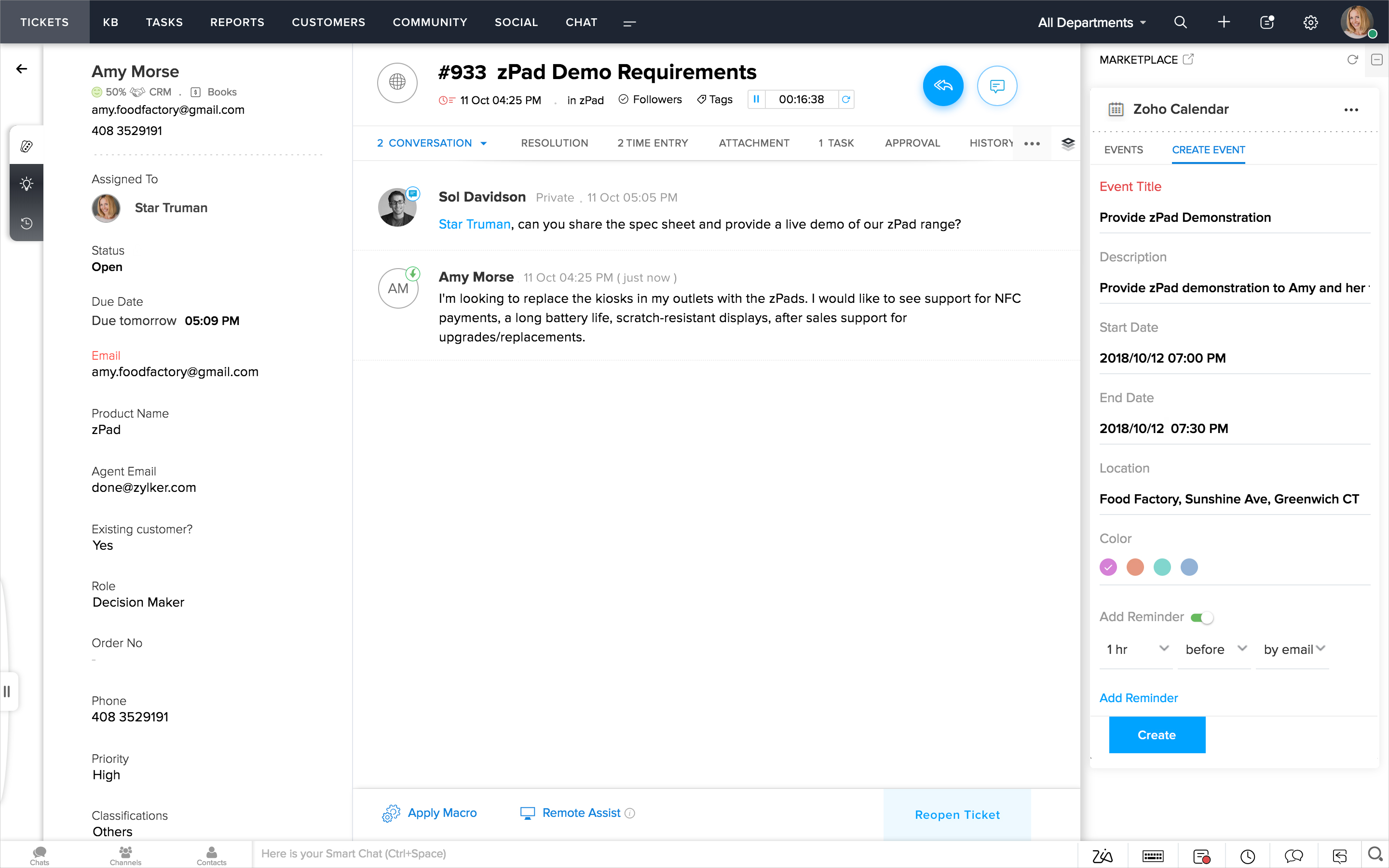 Zoho DeskのZoho Calendar拡張機能を使用すると、カレンダーに登録されている予定を問い合わせに添付できます。問題を調査するためのリモートサポート、状況報告の電話、訪問といった問い合わせに関する予定をZoho Desk内で記録し、Zoho Calendarと同期することができます。拡張機能では、リマインダーを設定することもできます。重要な予定に関する通知を前もって受け取ることができます。