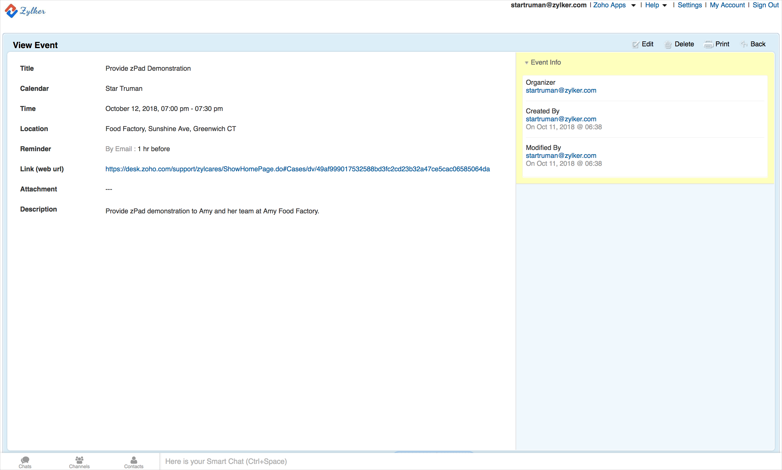 Zoho Calendarアカウントから問い合わせに添付された予定を表示できます。カレンダーの予定の[View](表示)をクリックすると、詳細が表示されます。予定を開くと、予定が作成された問い合わせへのリンクが表示されます。リンクをクリックすると、問い合わせの詳細を表示できます。