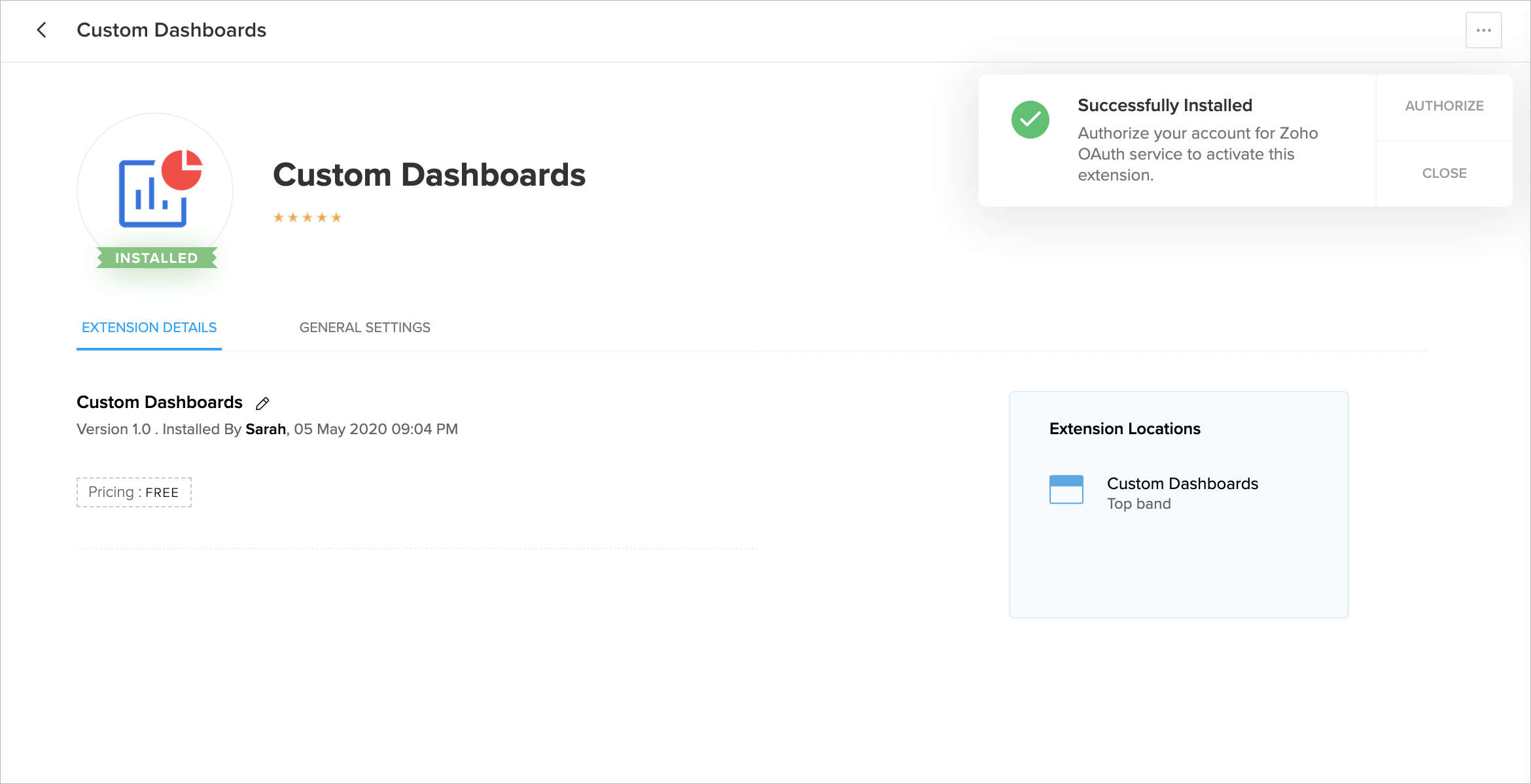 Custom Dashboards拡張機能は、Zoho Marketplace、または、Zoho Deskアカウントからインストールできます。