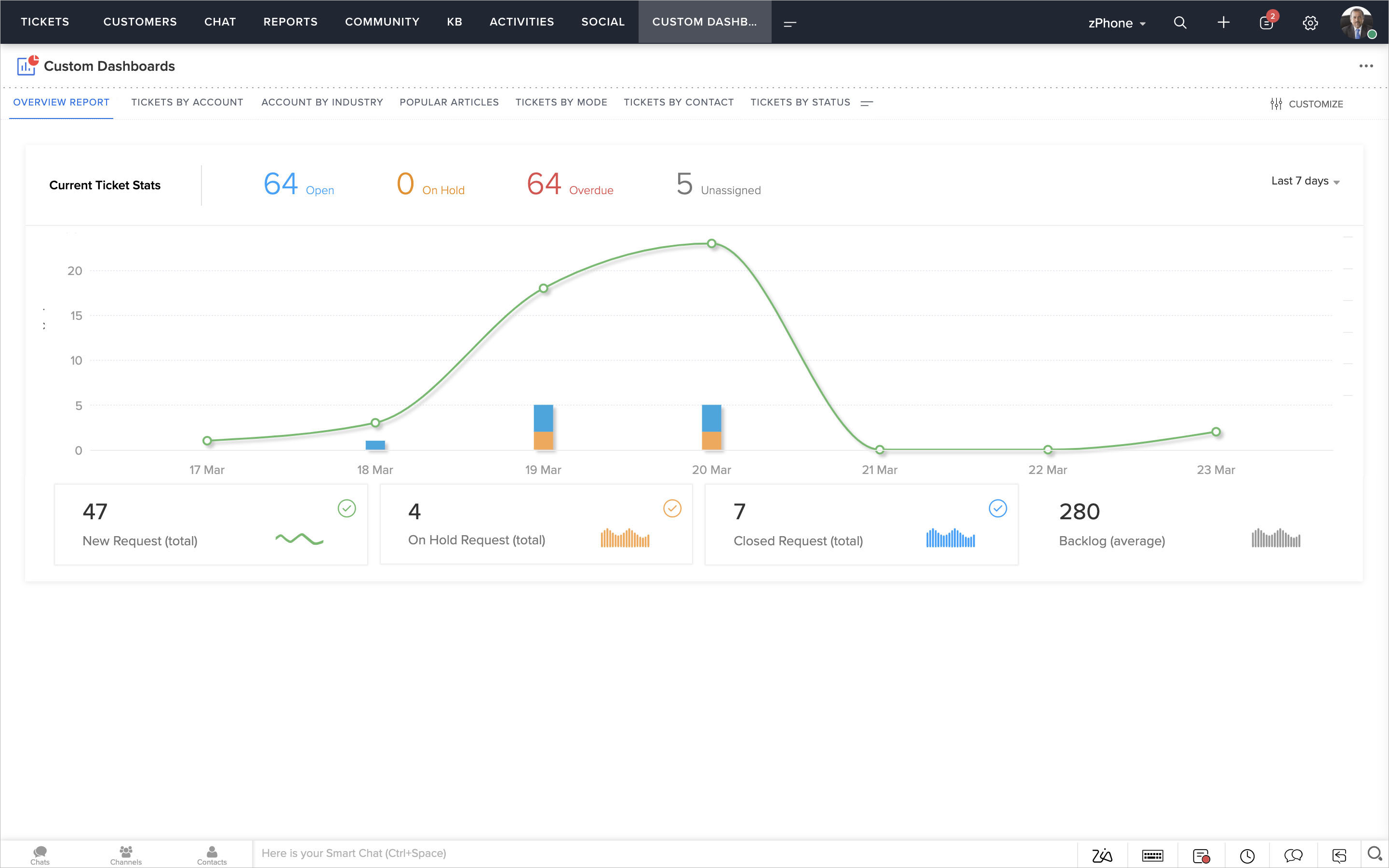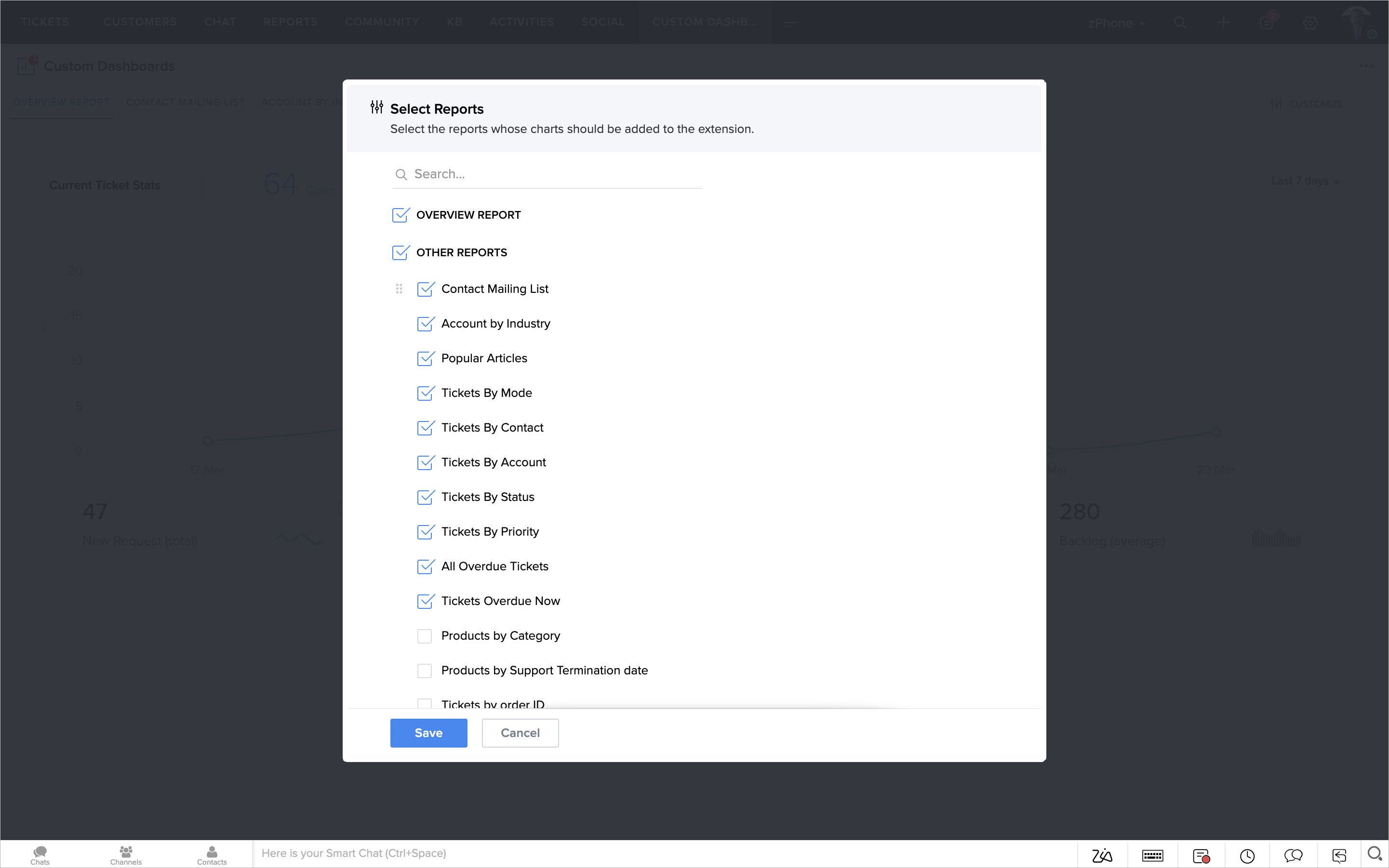 拡張機能をインストールすると、最初の10件のレポートのダッシュボードが自動的に追加されます。これらのダッシュボードには、Zoho Deskの上部メニュー(メニューバー)からアクセスできます。