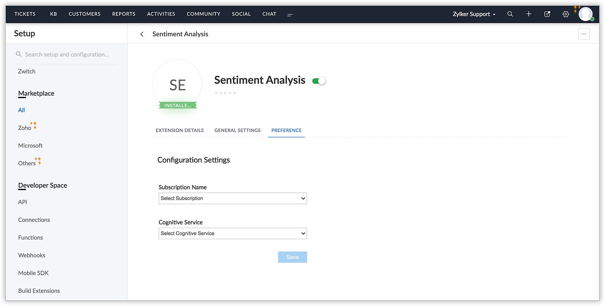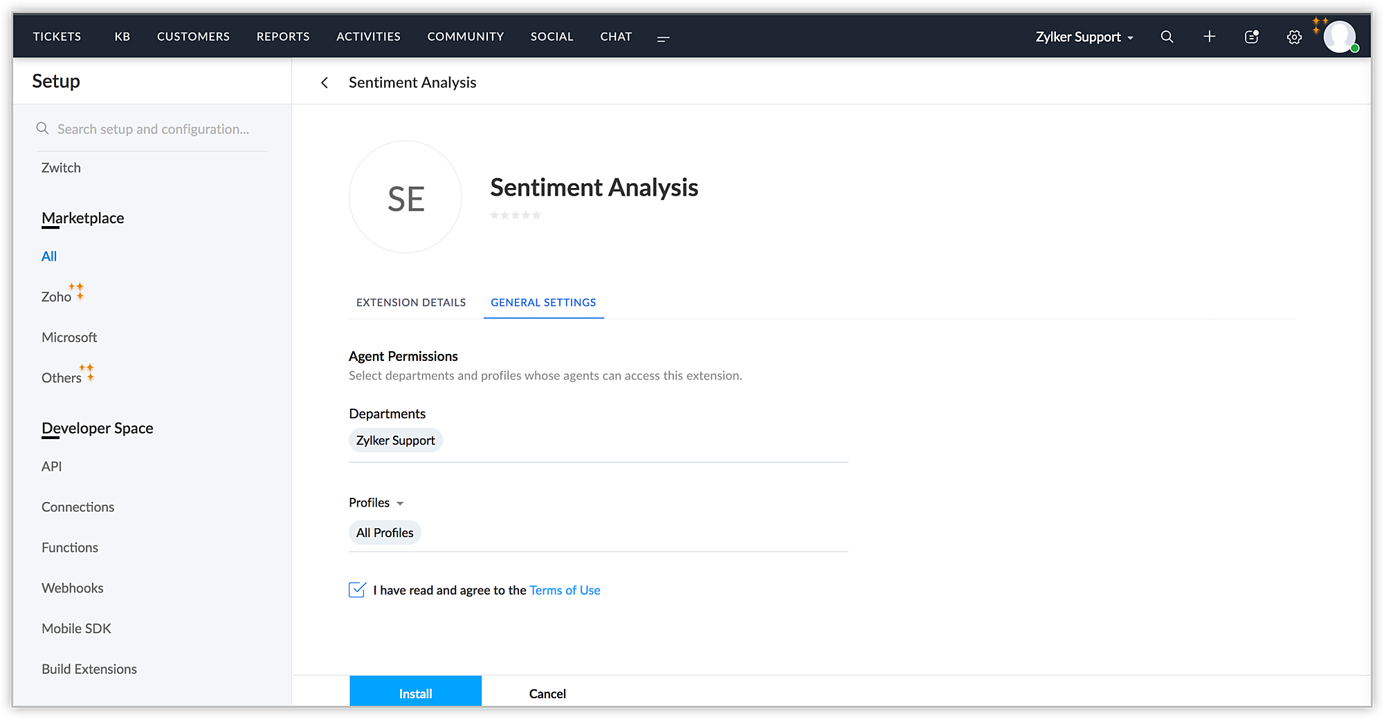 Microsoft Sentiment Analysis拡張機能はZoho Marketplace、またはZoho Deskアカウントからインストールできます。