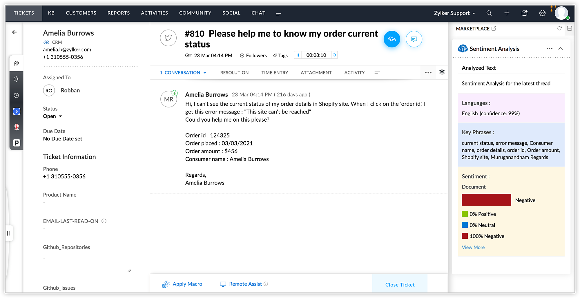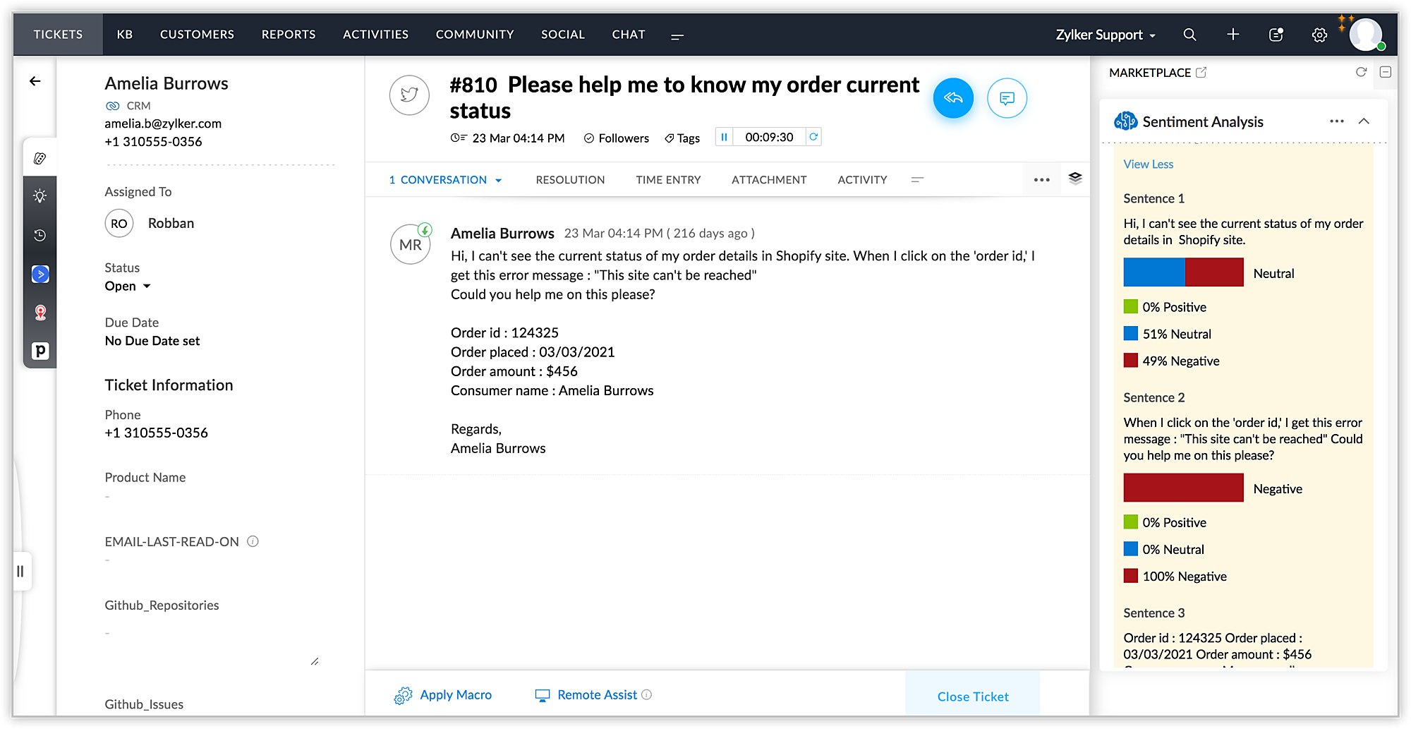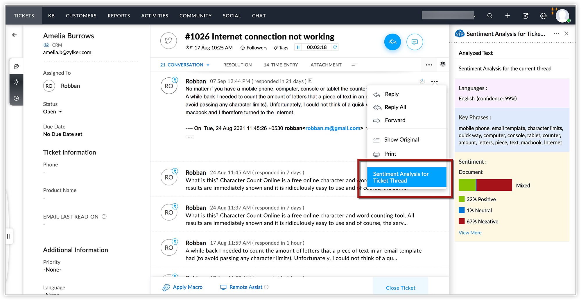 Zoho Deskで問い合わせを開くと、Microsoft Sentiment Analysis拡張機能によって最後に受け取ったメールの内容の感情分析が行われます。他のメールの内容や下書きに保存されているメールの内容を分析することもできます。