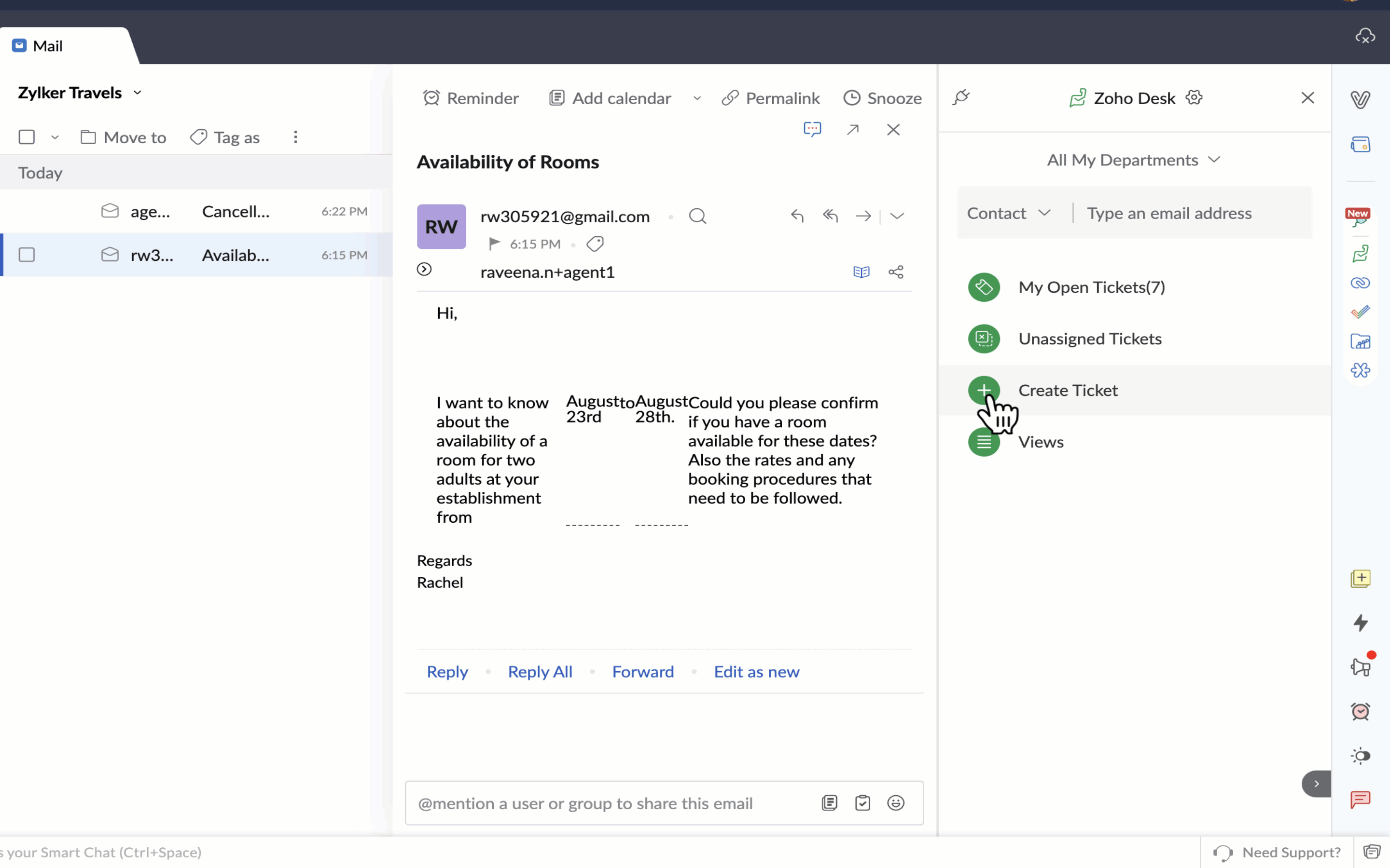3.  問い合わせの割り当ての自動化:Zoho Deskで設定した割り当てルールに基づき、Zoho Mailを通じて顧客から受信したメールの問い合わせを、担当者に自動で割り当てることができます。