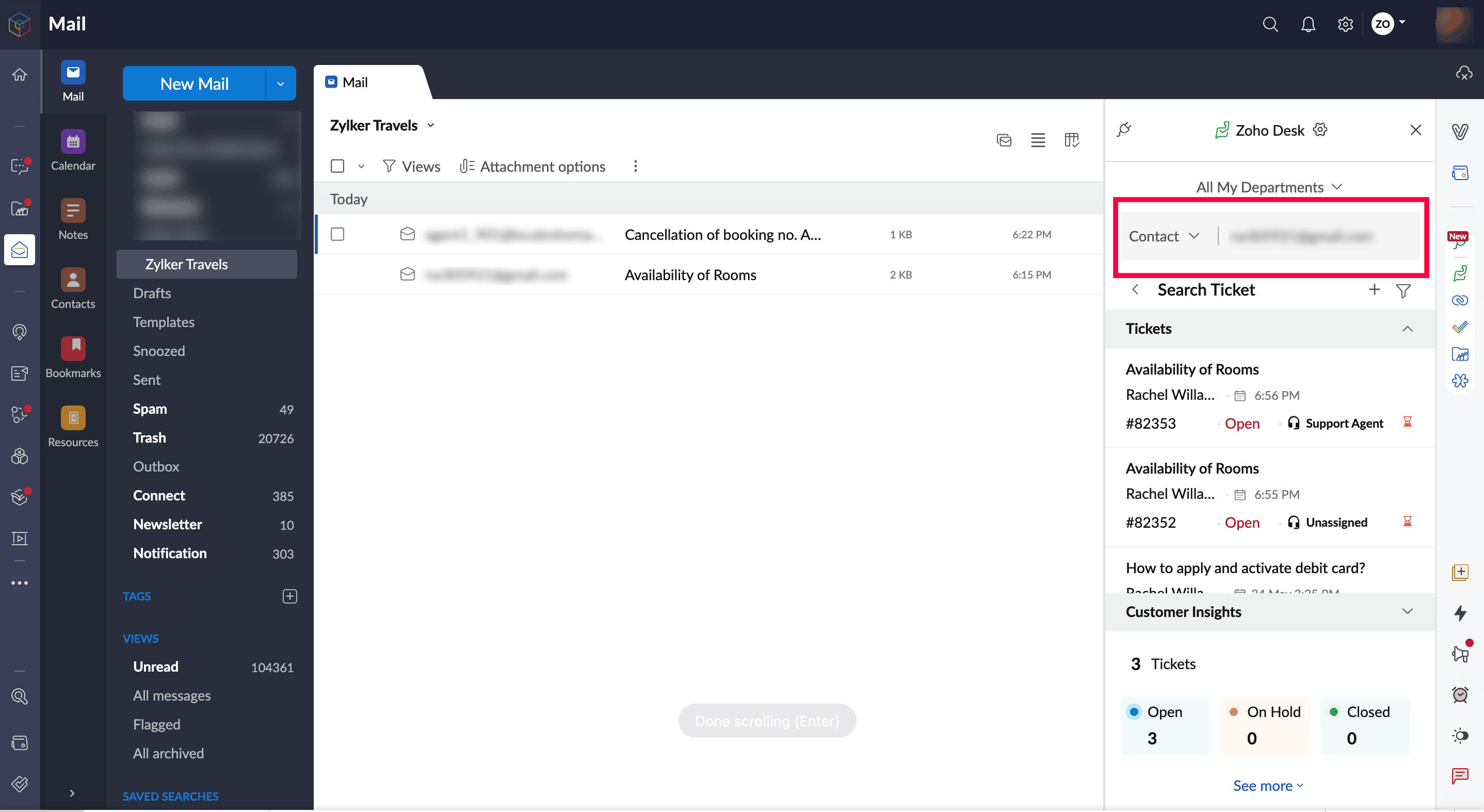 2.  問い合わせ対応の効率化:  Zoho DeskとZoho Mailとの間で問い合わせや連絡先のデータを双方向で同期できるため、担当者はどちらのサービスからでもデータを参照できます。画面を切り替える手間なく、問い合わせメールへの返信、問い合わせへのコメント追加、問い合わせの履歴や詳細の表示などのさまざまな操作を簡単に行うことができます。