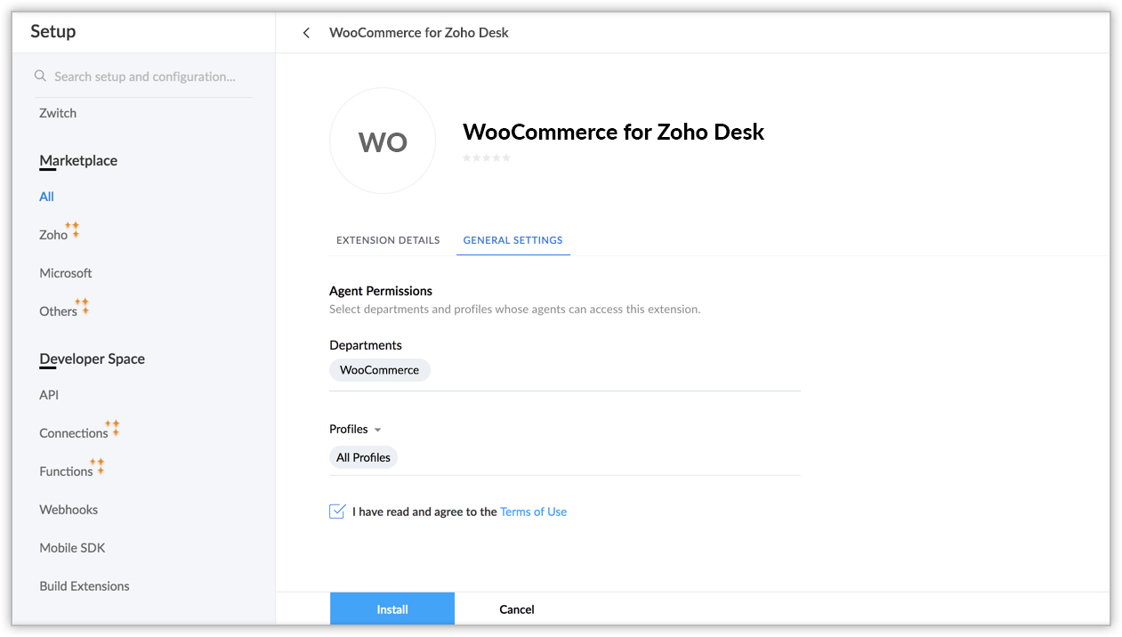 WooCommerce拡張機能はZoho Marketplace、またはZoho Deskアカウントからインストールできます。
