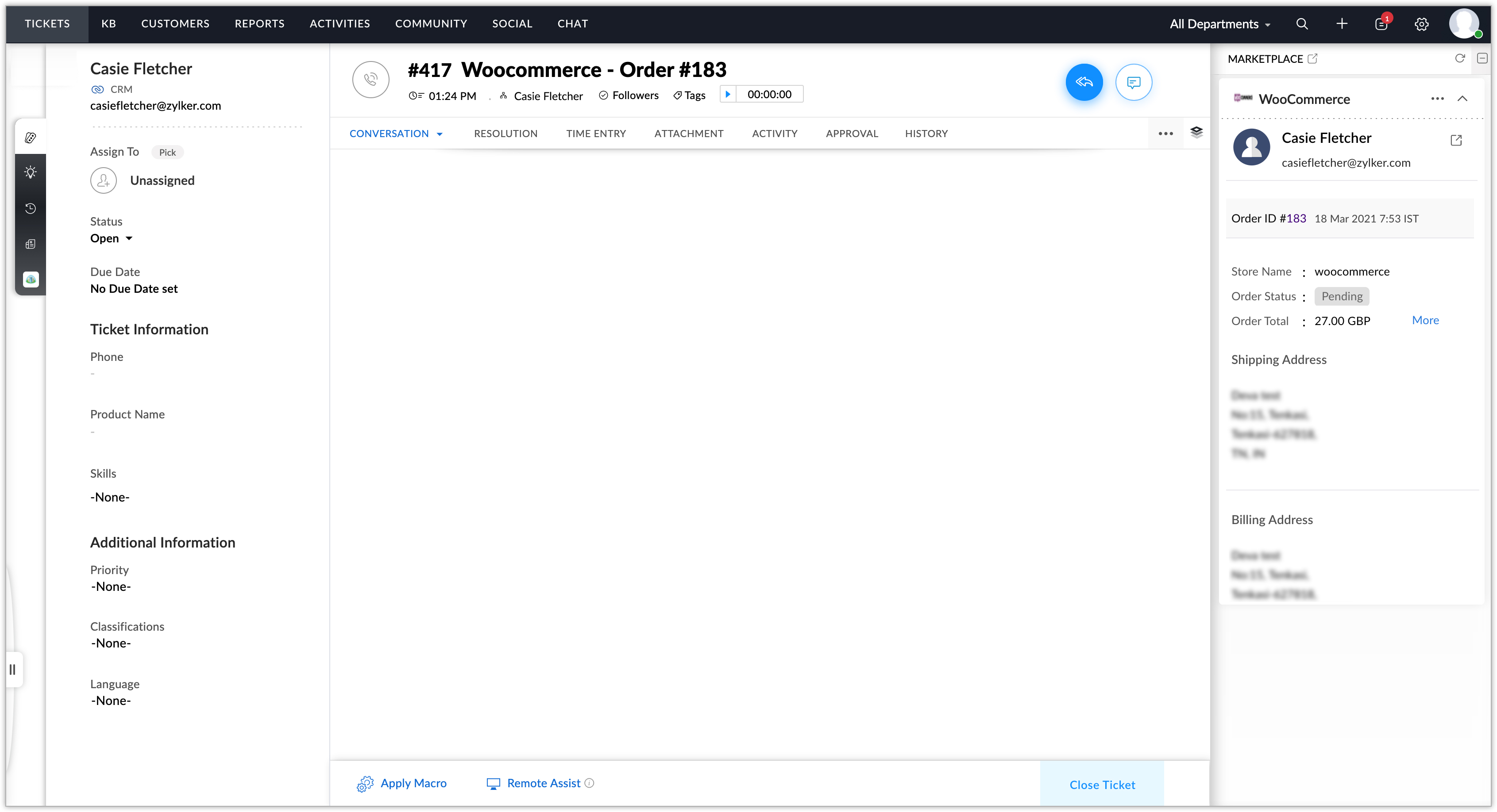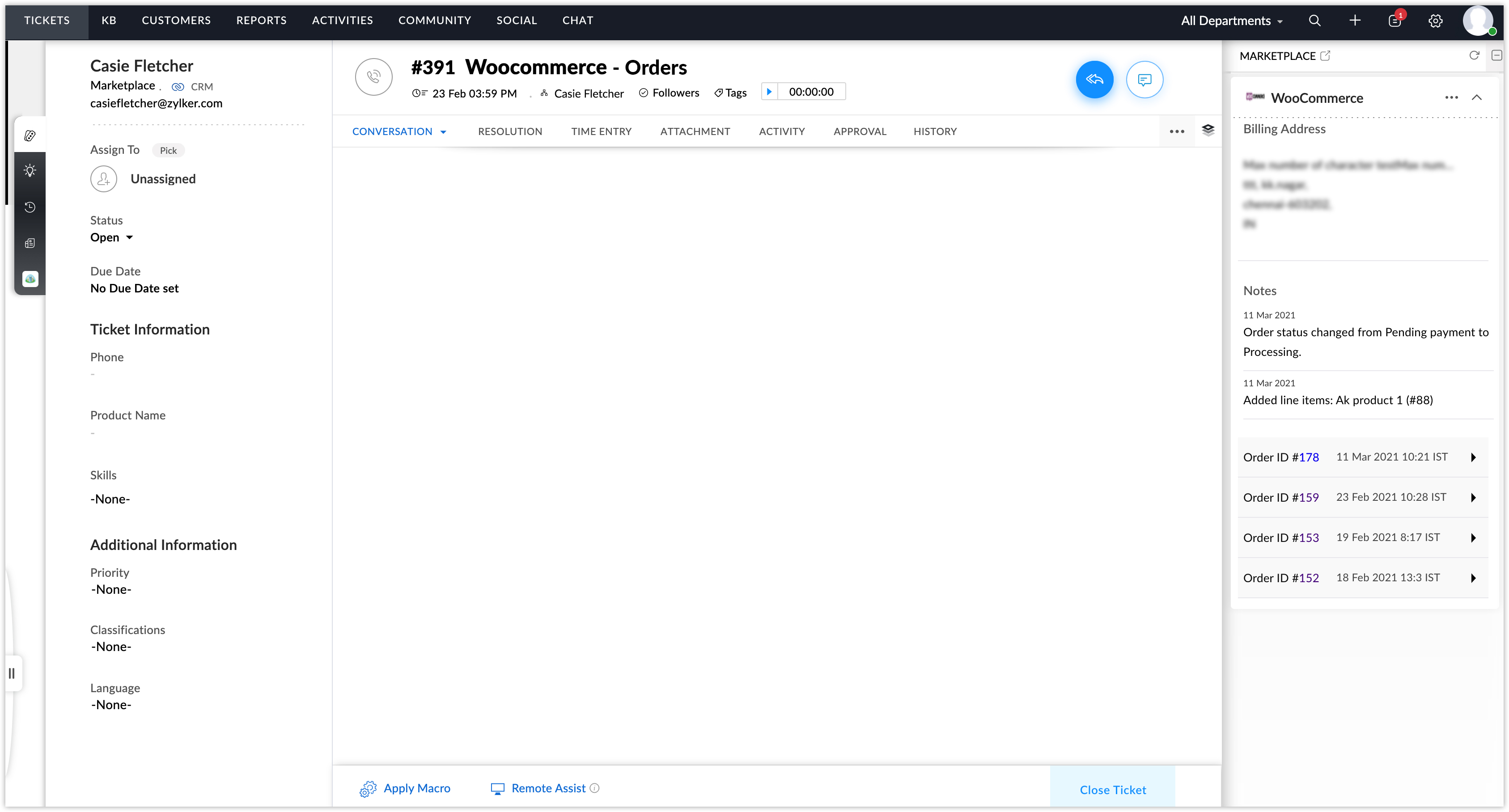 3. Zoho Deskにすでに登録されている顧客によってWooCommerceで注文が行われると、Zoho Deskで問い合わせが作成されます。作成された問い合わせを開くと、ウィジェットに注文の詳細情報が表示されます。