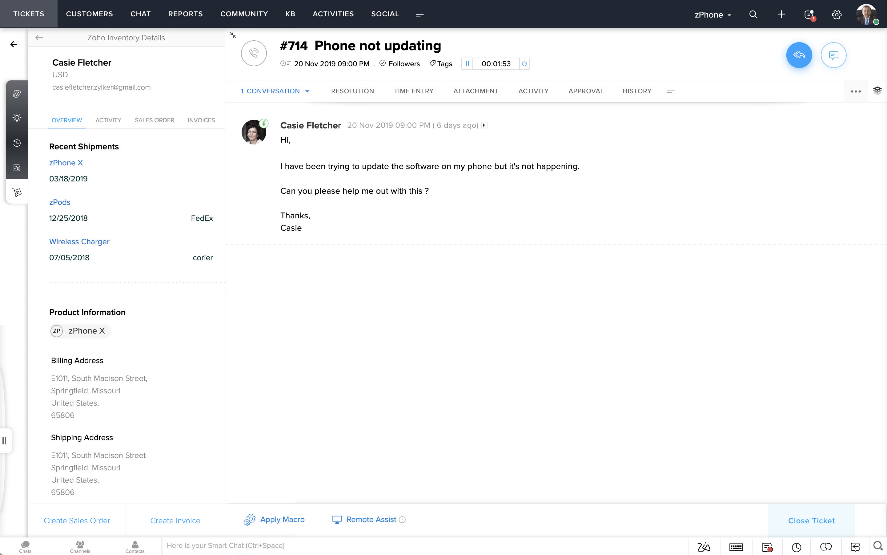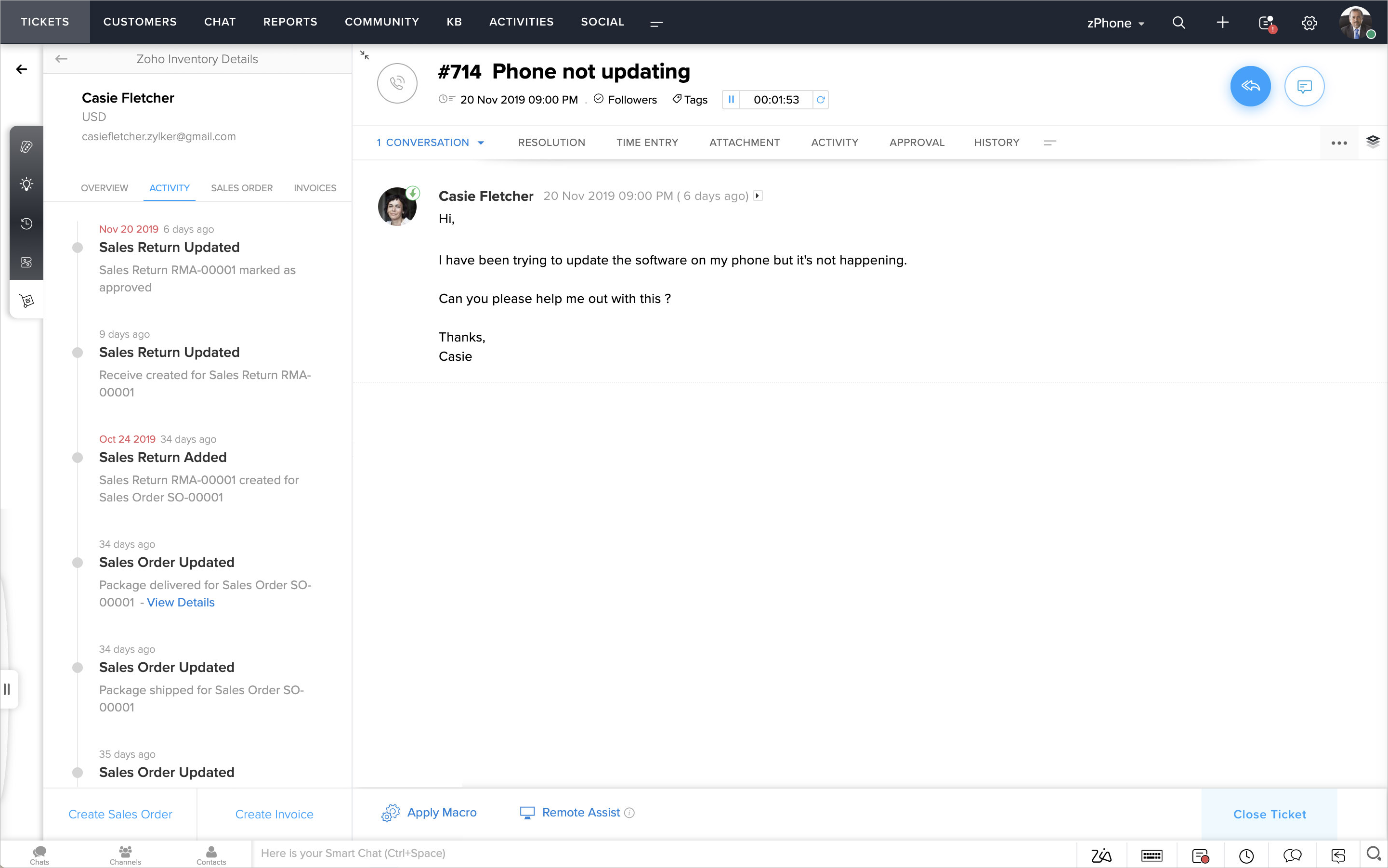 顧客とのやりとりにおいて背景や関連情報を把握することは、顧客をよりよく理解することにつながります。これは、カスタマーサービス業務と在庫管理業務に共通しています。顧客とビジネスを行う上で、とても重要です。在庫管理アプリケーションであるZoho Inventoryと顧客サポートやカスタマーサクセスのソリューションであるZoho Deskを連携することで、担当者は問い合わせ内から顧客の現在の状況をすばやく詳細に確認することができます。在庫情報とサポート情報を連携することで、顧客に対してシームレスに対応することができます。
